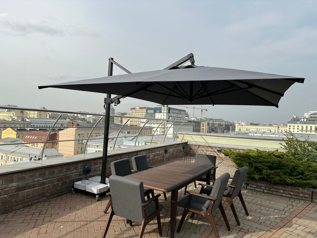 Banana Plus - новейшая модель компании THEUMBRELA, сочетающая в себе высококачественные материалы, впечатляющие технологии и простое управление. Это особенный продукт для тех, кто ищет крутой дизайн, стильный внешний вид и функциональность среди зонтов с боковой опорой. Зонт легко открывается и закрывается при помощи рукоятки, а сам механизм блокируется для безопасности. Купол может подниматься под углом до 60°. Для того, чтобы закрыть или открыть зонт Banana Plus, не нужно двигать мебель под ним. Особенности: Боковая опора сечением 70х70 мм и толщиной стенки 2.5 мм выполнена из окрашенного алюминия со специальной термообработкой, которая повышает прочность и коррозионную стойкость зонта. Высота опоры - 3100 мм. 8 спиц из алюминия сечением 20х30 мм и толщиной стенки 2 мм. Термообработанный и усиленный кронштейн и каркас. Прочные пластиковые детали и соединительные элементы. В комплект входит металлическая база на колесах. Функцию вращения на 360º можно приобрести дополнительно. Покрытие опоры и спиц можно выбрать из представленной палитры. Возможно выполнение купола из тканей: бежевый полиэстер, олефин. Цвет купола из ткани олефин можно выбрать из представленной палитры. Открыть инструкцию поэксплуатации уличных зонтов. Обращаем Ваше внимание! Плиты идут в подарок к зонту! В норме допускаются незначительные сколы и царапины мрамора по периметру, т.к. мрамор - это природный материал. На плиты рекламации не принимаются, Вы имеете право безвозмездно отказаться от них. Цена на сайте указана за модель с каркасом цвета антрацит и куполом из ткани олефин. Цены на другие модели Вы можете уточнить у менеджеров.Характеристики