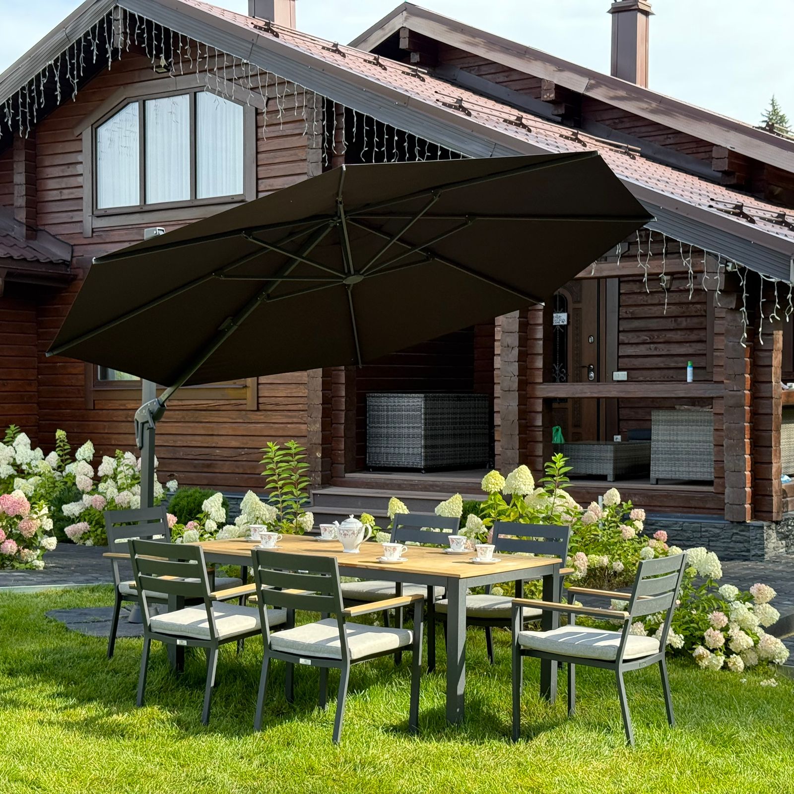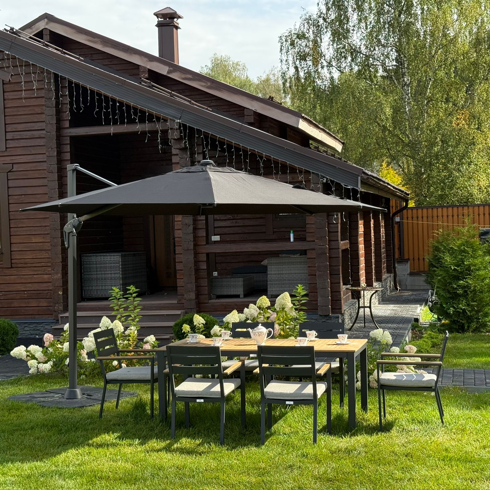 Комплектация и габариты: Зонт: 3,5х3,5 м. Высота зонта в сборе: 260 см. Утяжелители(плиты 4 шт.): 51х51х7 см(размер одной плиты) Материалы: Стойка - алюминий Подвесная опора - алюминий База - алюминий Утяжелители - плиты из высококачественного пластика, заполненные изнутри бетоном(4 шт.) Ткань - полиэстер 200 мг. Цвет зонта - черный Дополнительная информация: Механизм - вращающийся на 360 градусов. Температурный режим - от -50॰C до +50॰C Сочетается с комплектами бренда ROYAL FAMILY Гарантийный срок - 1 год Эксплуатационный срок - 10 лет Страна производитель - КитайХарактеристики