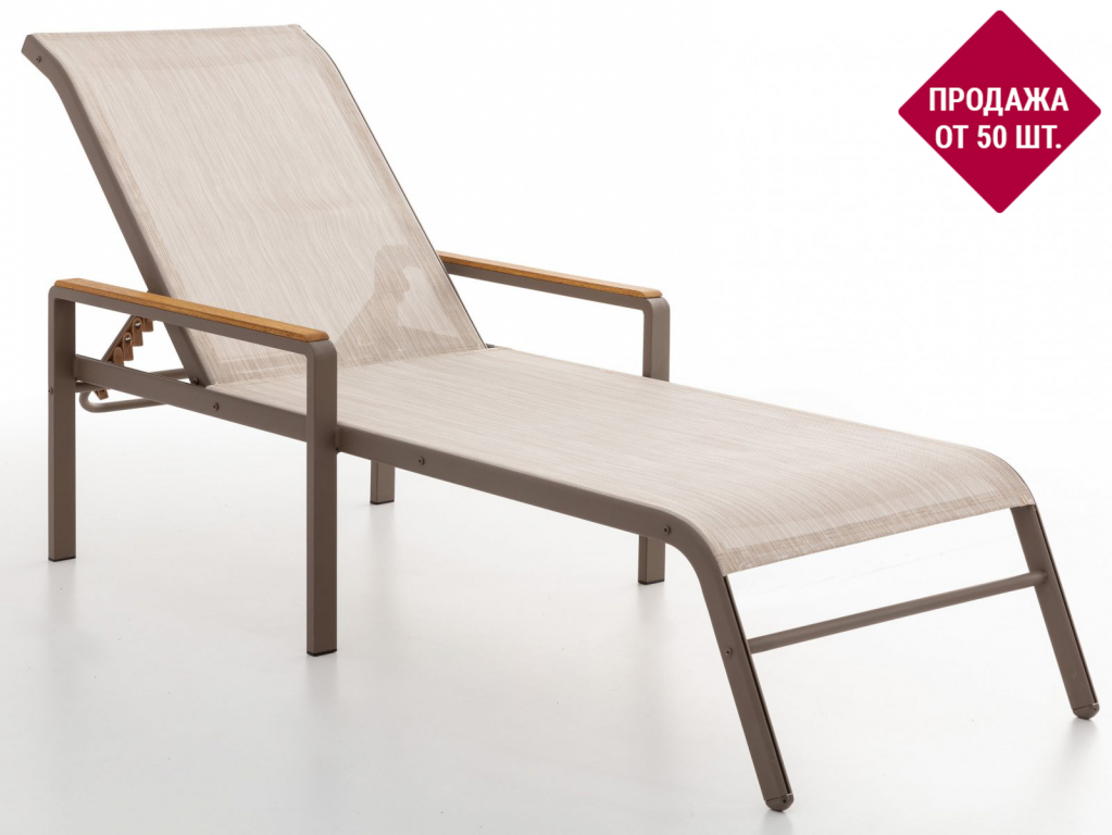 Минимальный заказ данной модели 50 шт. Металлический лежак Alacati сочетает в себе долговечность алюминиевого каркаса и комфорт текстиленового покрытия. Благодаря стильному и современному дизайну впишется в различные открытые пространства: террасы, пляжные и лаунж зоны, площадки возле бассейна и т.д. Особенности: Каркас выполнен из алюминия 1 класса, окрашенного порошковой краской. Он легкий, долговечный и нержавеющий. Вставки выполнены из древесины ироко, которая подходит для любых климатических условий, не требует сложного ухода, устойчива к гниению и появлению вредителей. Покрытие выполнено из текстилена, устойчивого к УФ-излучению. Спинка регулируется в нескольких положениях. Мебель соответствует эргономике человека; она разработана с учетом комфорта, качества, длительного использования и возможности переработки. Открыть инструкцию по уходу.Характеристики
