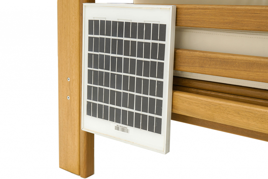 Раскройте потенциал отдыха и работы на свежем воздухе с нашим инновационным шезлонгом Loca. Модель оснащена солнечной панелью, которая эффективно преобразует солнечный свет в электричество, позволяя заряжать ваши устройства без вреда для окружающей среды. Два порта, быстрая USB-зарядка и мощный аккумулятор обеспечивают полную независимость от сети, где бы вы ни находились. Особенности: Лежак полностью выполнен из ироко - это африканский дуб, порода дерева, отличающегося своей повышенной прочностью и долговечностью. Структура дерева отделана наилучшим способом, дарит приятные бархатистые ощущения от прикосновения. Мебель из ироко допускает круглогодичную эксплуатацию на открытом воздухе, выдерживает перепады температур от –30°C до +30°C. Мощный аккумулятор 12В 9А для длительной работы. Солнечная поликристаллическая панель мощностью 10 Вт. Два порта 12-24В (5А) и быстрая USB-зарядка Матрас и навес выполнен из олефина. Ткань Olefin обеспечивает комфортное использование благодаря своей прочной и легкой структуре. Это незаменимый спаситель уличных пространств благодаря своей быстрой сушке и устойчивости к истиранию, солнечному свету, грязи и пятнам, а также к ухудшению состояния, вызванному химикатами, потом, плесенью, и погодными условиями. Возможные цвета ткани указаны в палитре на сайте. Открыть инструкцию по уходу. Цена указана за модель в комплекте с матрасом. Для уточнения всех возможных вариантов материала и цвета данного изделия обращайтесь к нашим менеджерам.Характеристики