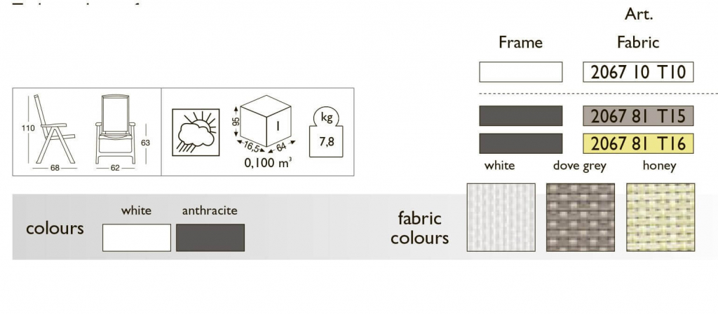 Esmeralda Lux - последнее поколение в дизайнерских креслах-шезлонгах с дышащим покрытиемв различных цветах от дизайнеров Centro Stile Scab. Элегантный, простой и функциональный, он имеет основную линейную форму, которая сочетает в себе современный и традиционный вид, подтверждая свое место на уровне вечнойклассики. Каркас, выполненный полностью из термопластичного материала и регулируемая спинкадемонстрируют практичность и удобство этого кресла-шезлонга, гарантируя прочность. Престижный дизайн делает его идеальным для использования на морских курортах, пляжах, бассейнах и эксклюзивных туристических местах отдыха. Каркас выполнен из полипропилена. Покрытие выполнено из дышащей водонепроницаемой ткани - текстилена. Спинка регулируетсяв 5 различных положениях. Данная модель подходит для использования внутри помещения и на открытом воздухе. Scab Giardino - фабрика, выпускающая высокопрочную качественную мебель из пластика, которая не жалеет денег на постоянное совершенствование дизайна и качества своей продукции и на разработку новых моделей пластиковой мебели. Пластик Scab не боится дождя и перепадов температур, со временем не теряет насыщенности цвета, лёгкий и не коробится на солнце. Мебель из пластика SCAB очень практична, не надо стелить скатерти на столы и запачканный стол достаточно просто протереть.Характеристики