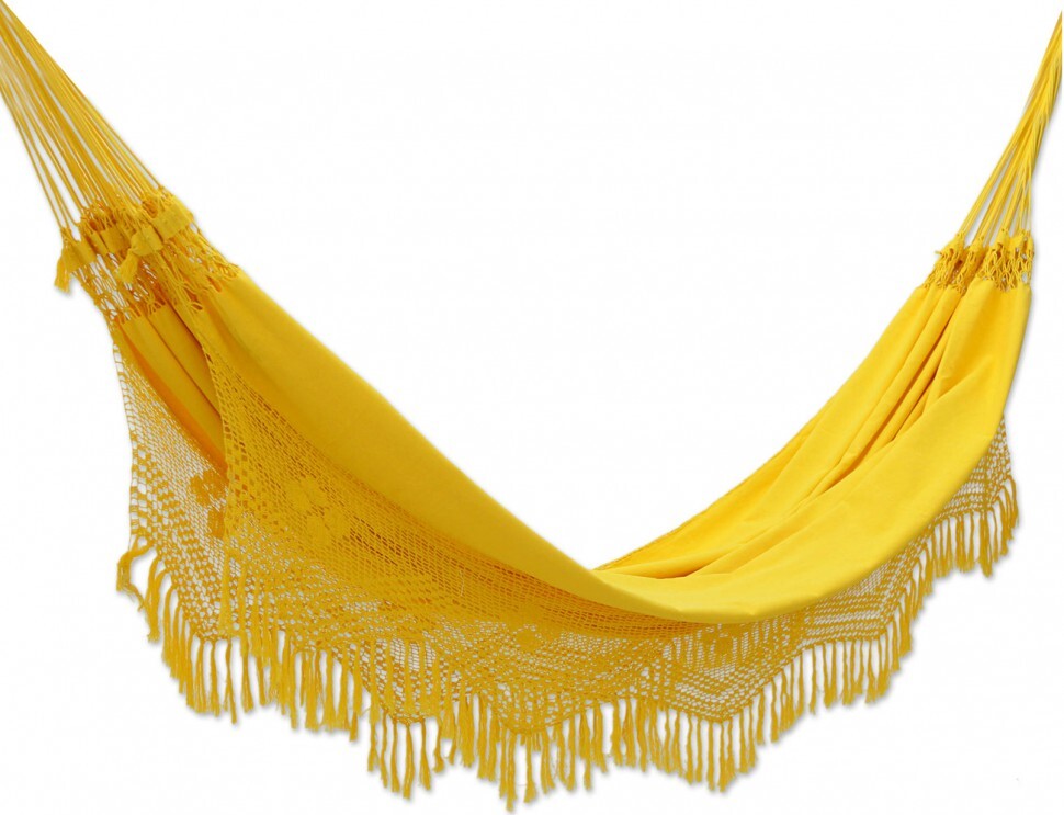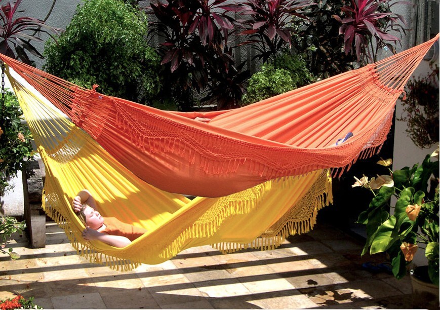 Стильный, большой комфортный гамак ФОРРО сделан из высококачественного хлопка, мягкое волокно которого прекрасно адаптируется к форме тела и дышит. Полотнище гамака отделано бахромой (hand made), которая сплетена из волокон настоящего бразильского ореха и сделана в цвет полотна гамака. Гамак такой формы это традиционная форма исконно южно американских гамаков, «правильно» и удобно лежать в таких гамаках по диагонали . Гамак «ФОРРО» подходит для кратковременного отдыха или может временно заменить кровать, где уютно можно расположиться не только одному, но и вдвоем. Гамак упакован в красивой и удобной для транспортировки сумке из хлопка.. Размер полотна: 240 X 165 см Общая длина: 380 см Вес гамака: 1,8 кг Выдерживаемый вес: 180 кгХарактеристики