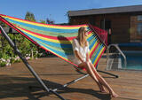 Яркий полосатый гамак МЕХИКО придется по вкусу всем, кто ценит высокое качество. Выполненный из хлопка гамак очень приятен на ощупь, не липнет к коже в жаркую погоду, гигиеничен и комфортен. Полотно гамака — эластичные нити легко тянутся, принимая форму вашего тела и обеспечивая максимум удобства. Гамак изготавливается из высококачественного хлопка методом плетения. Бренд BESTA FIESTA выбирают потому, что мы не просто предлагаем красивую мебель — мы дарим возможность открыть новое качество отдыха.. Размер полотна: 230 X 80 см Общая длина: 290 см Вес гамака: 3 кг Выдерживаемый вес: 140 кгХарактеристики