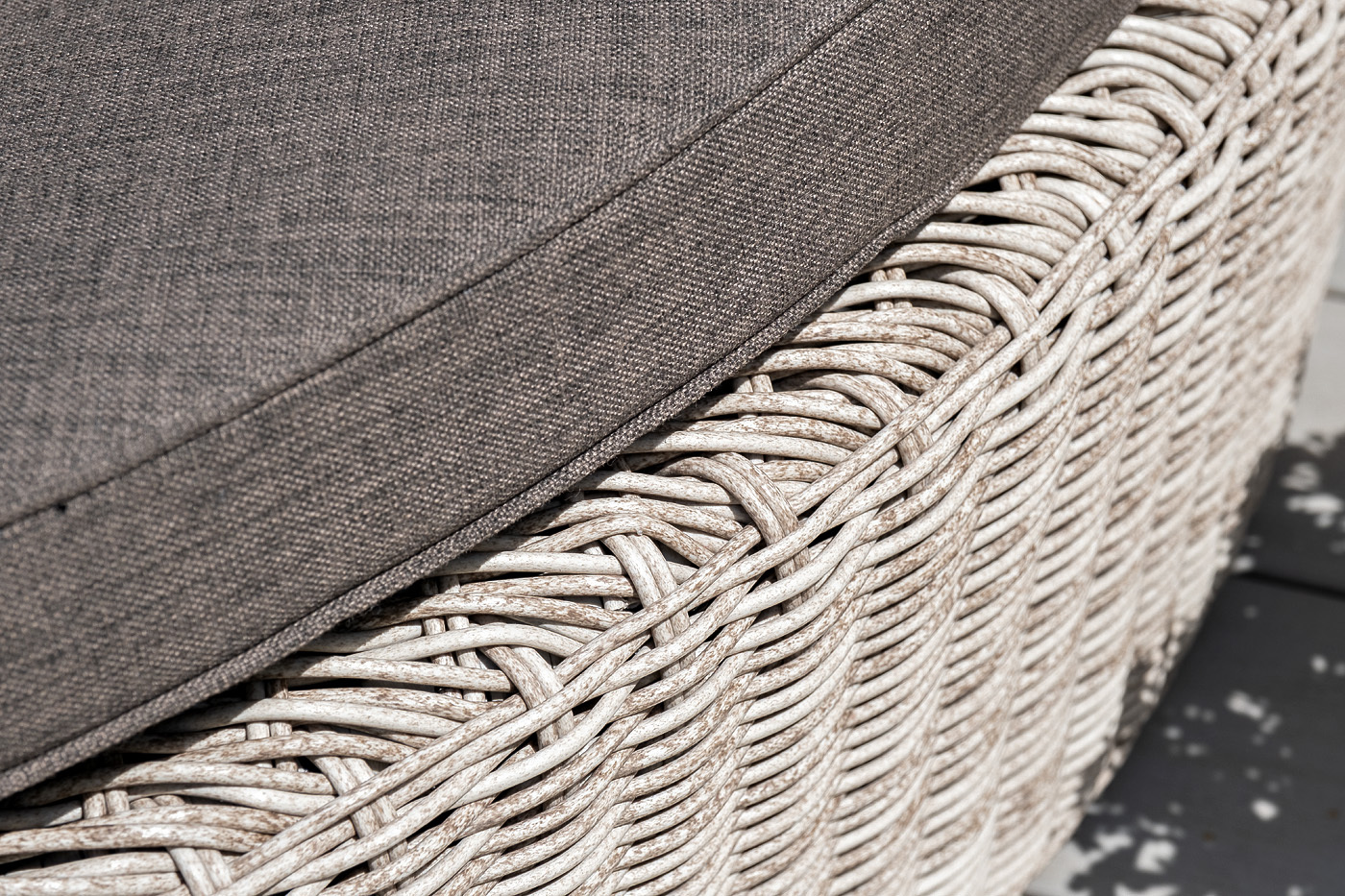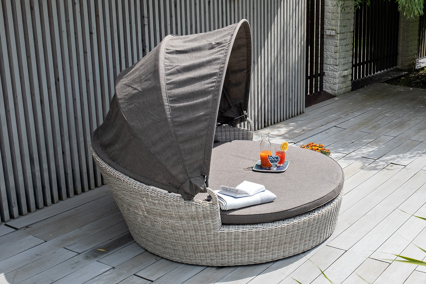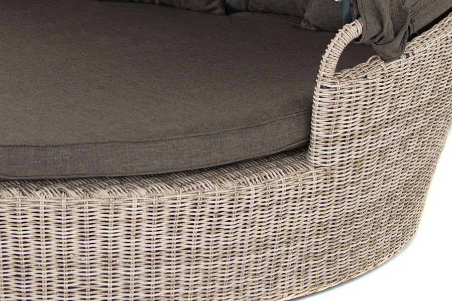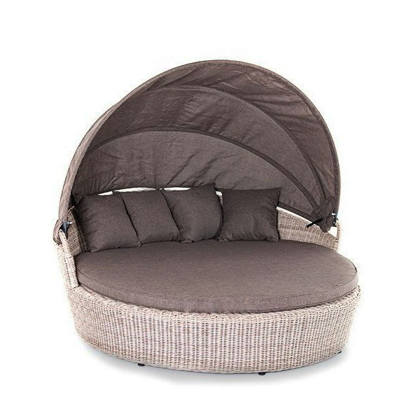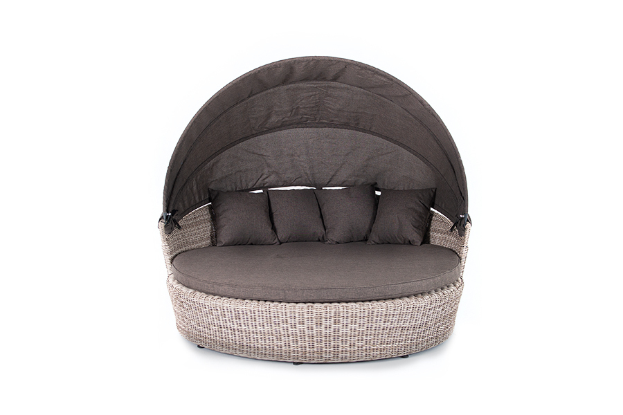 Круглая кровать из искусственного ротанга бежевого цвета «Стильяно» никого не оставит равнодушным благодаря своему неординарному дизайну. Данная модель имеет в основании прочный алюминиевый каркас, оплетенный вручную круглым ротангом бежевого цвета и оснащена регулируемым козырьком, который ограничивает попадание солнечных лучей. Выполнен из водостойкой полиэфирной ткани. Мягкий матрас имеет съёмный чехол серого цвета состоящий из высококачественного полиэстера с водоотталкивающей пропиткой, подлежит машинной стирке. Диаметр кровати составляет 1850 мм, а высота 800 мм. Комплектацией предусмотрен набор из четырех серо-коричневых подушек - 450х450 мм и одного матраса - Ø1600 мм, высотой 60 мм.Бренд | 4SIS |