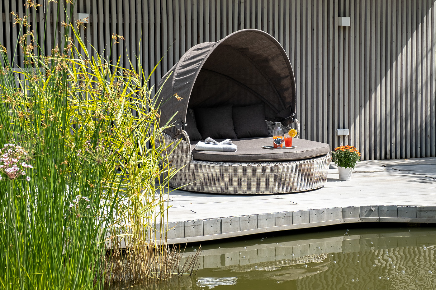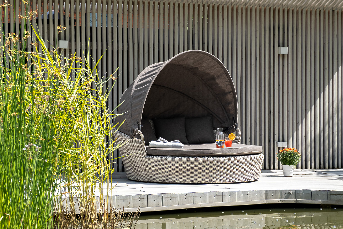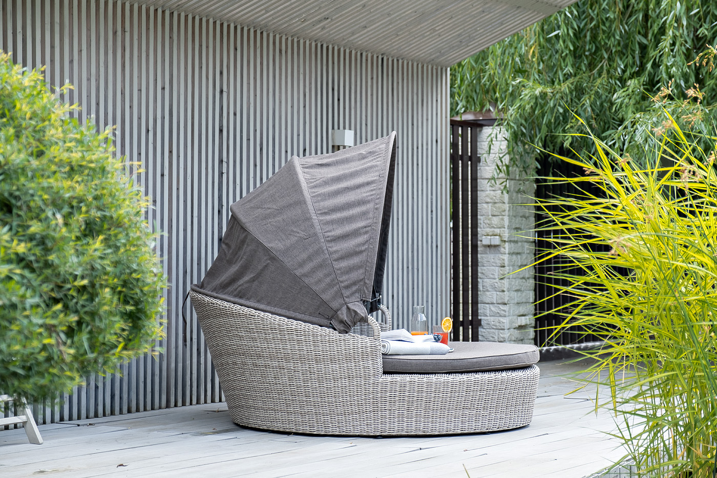 Круглая кровать из искусственного ротанга бежевого цвета «Стильяно» никого не оставит равнодушным благодаря своему неординарному дизайну. Данная модель имеет в основании прочный алюминиевый каркас, оплетенный вручную круглым ротангом бежевого цвета и оснащена регулируемым козырьком, который ограничивает попадание солнечных лучей. Выполнен из водостойкой полиэфирной ткани. Мягкий матрас имеет съёмный чехол серого цвета состоящий из высококачественного полиэстера с водоотталкивающей пропиткой, подлежит машинной стирке. Диаметр кровати составляет 1850 мм, а высота 800 мм. Комплектацией предусмотрен набор из четырех серо-коричневых подушек - 450х450 мм и одного матраса - Ø1600 мм, высотой 60 мм.Бренд | 4SIS |