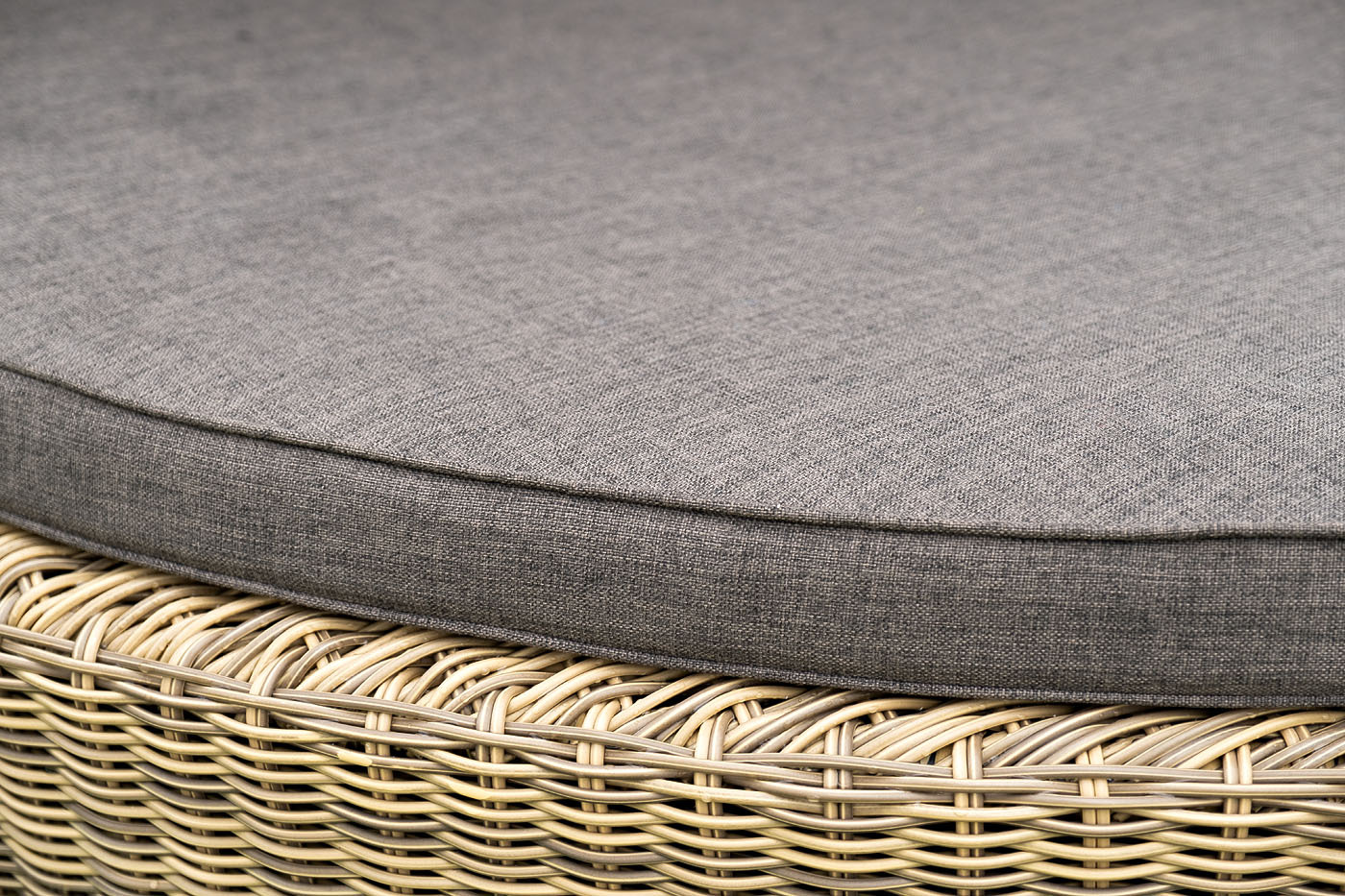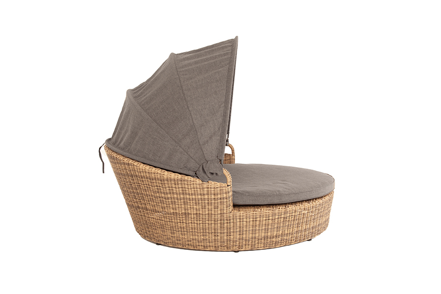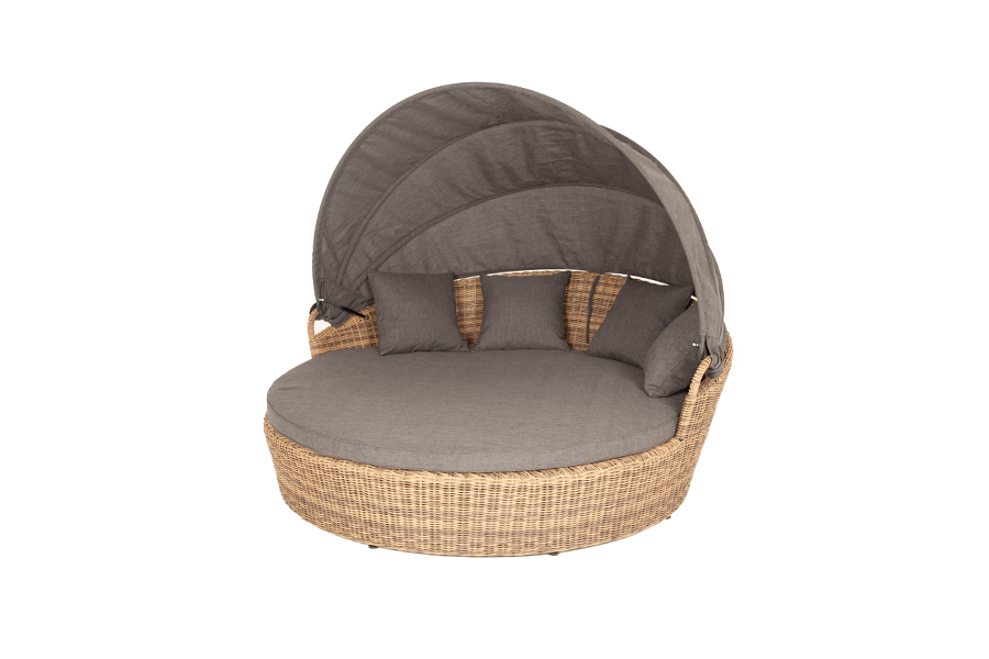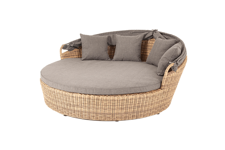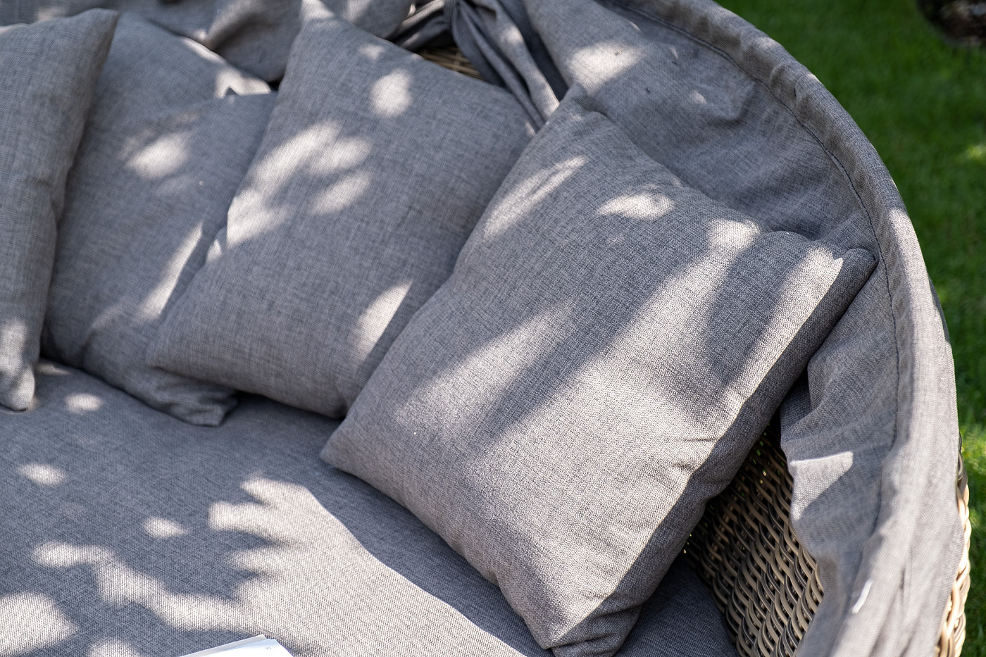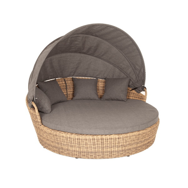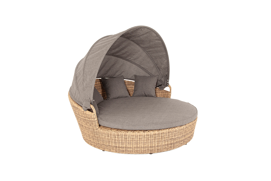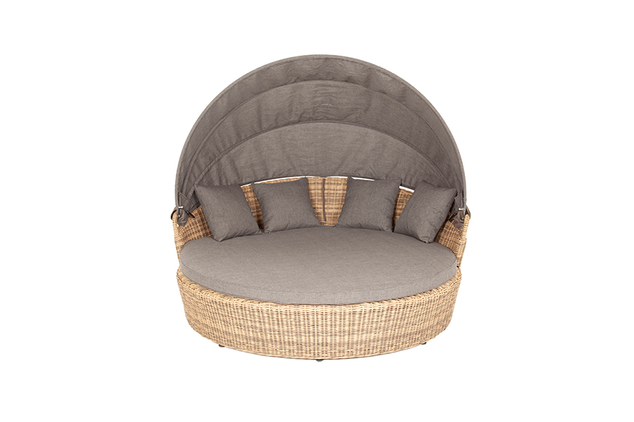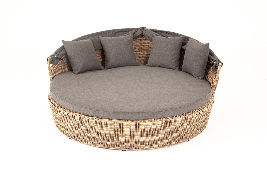 «Стильяно» - кровать из искусственного ротанга круглой формы. Она идеально подойдет для использования на открытом воздухе, в том числе и возле бассейна. Имеет соломенный оттенок. Данная модель имеет в основании прочный алюминиевый каркас, оплетенный вручную круглым ротангом и оснащена регулируемым козырьком, который ограничивает попадание солнечных лучей. Выполнен из водостойкой полиэфирной ткани. Мягкий матрас имеет съёмный чехол серого цвета состоящих из высококачественного полиэстера с водоотталкивающей пропиткой, подлежит машинной стирке. Диаметр кровати составляет 1850 мм, а высота 800 мм. Комплектацией предусмотрен набор из четырех серо-коричневых подушек - 450х450 мм и одного матраса - Ø1600 мм, высотой 60 мм.Бренд | 4SIS |
