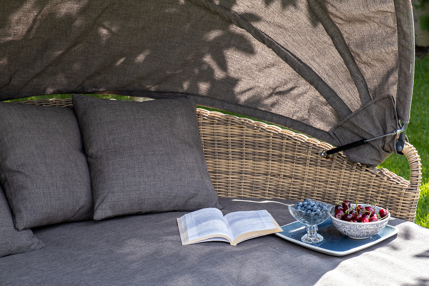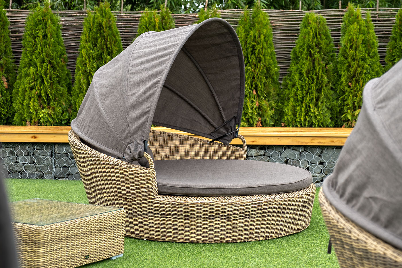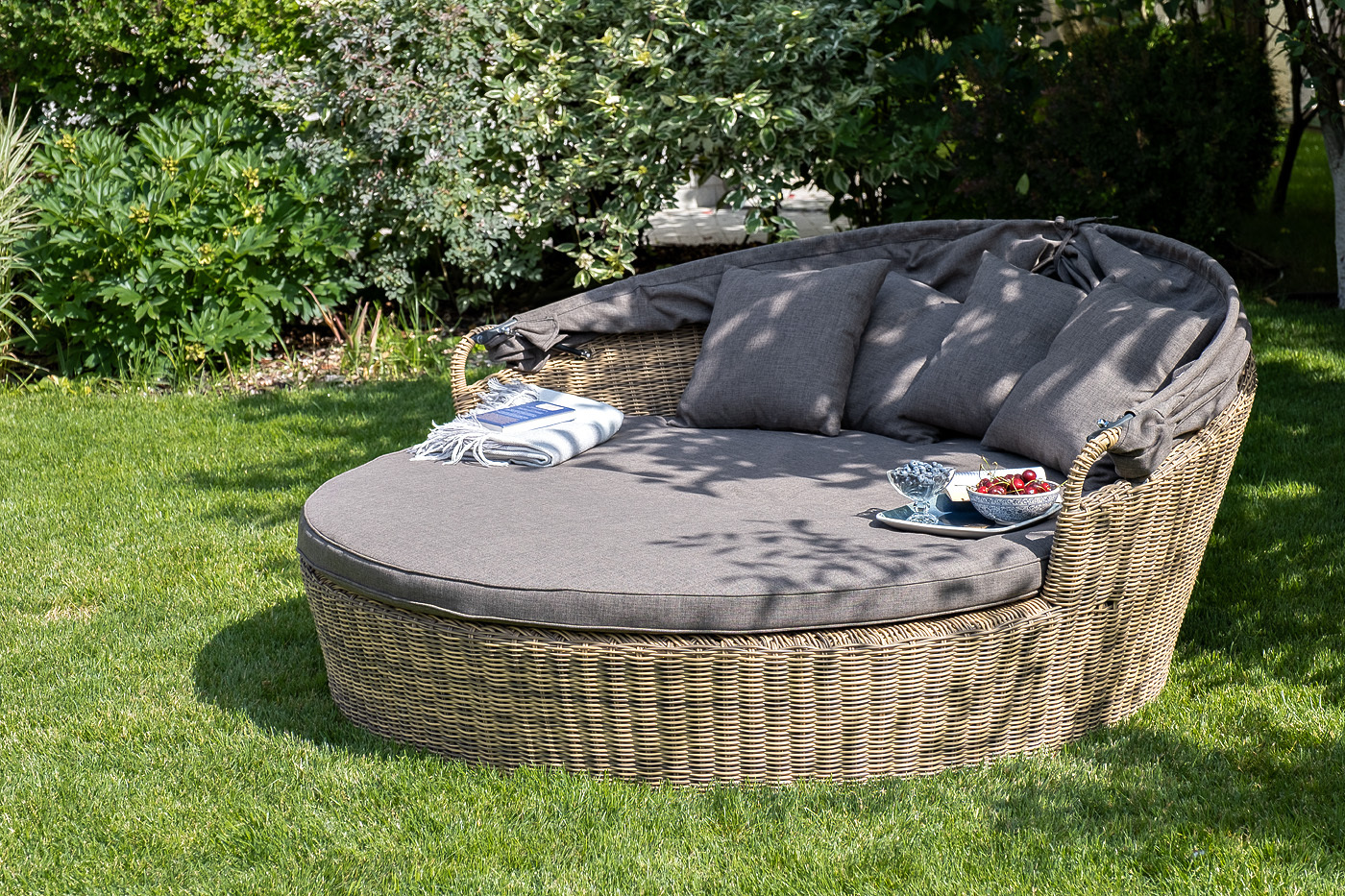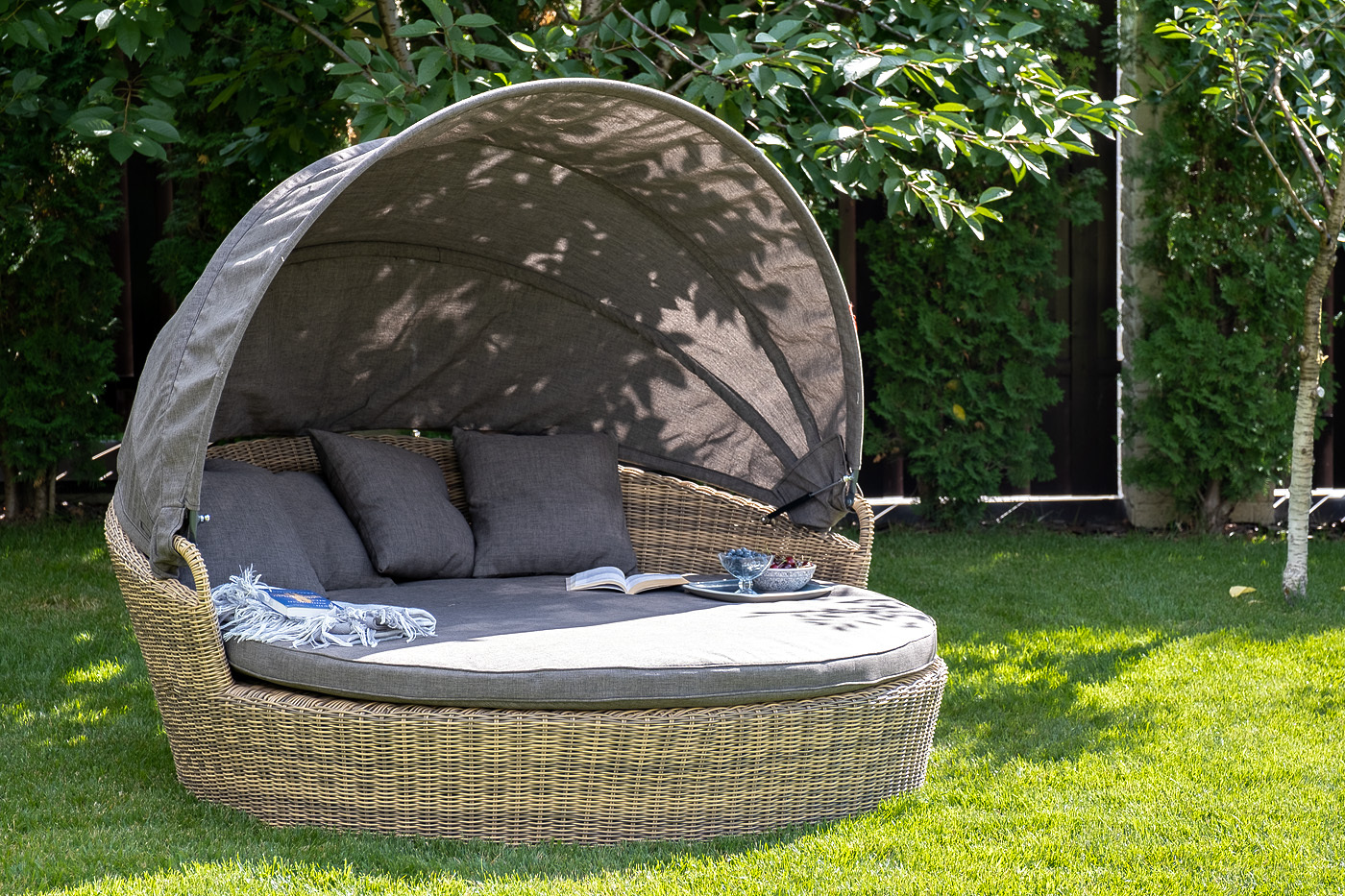 «Стильяно» - кровать из искусственного ротанга круглой формы. Она идеально подойдет для использования на открытом воздухе, в том числе и возле бассейна. Имеет соломенный оттенок. Данная модель имеет в основании прочный алюминиевый каркас, оплетенный вручную круглым ротангом и оснащена регулируемым козырьком, который ограничивает попадание солнечных лучей. Выполнен из водостойкой полиэфирной ткани. Мягкий матрас имеет съёмный чехол серого цвета состоящих из высококачественного полиэстера с водоотталкивающей пропиткой, подлежит машинной стирке. Диаметр кровати составляет 1850 мм, а высота 800 мм. Комплектацией предусмотрен набор из четырех серо-коричневых подушек - 450х450 мм и одного матраса - Ø1600 мм, высотой 60 мм.Бренд | 4SIS |