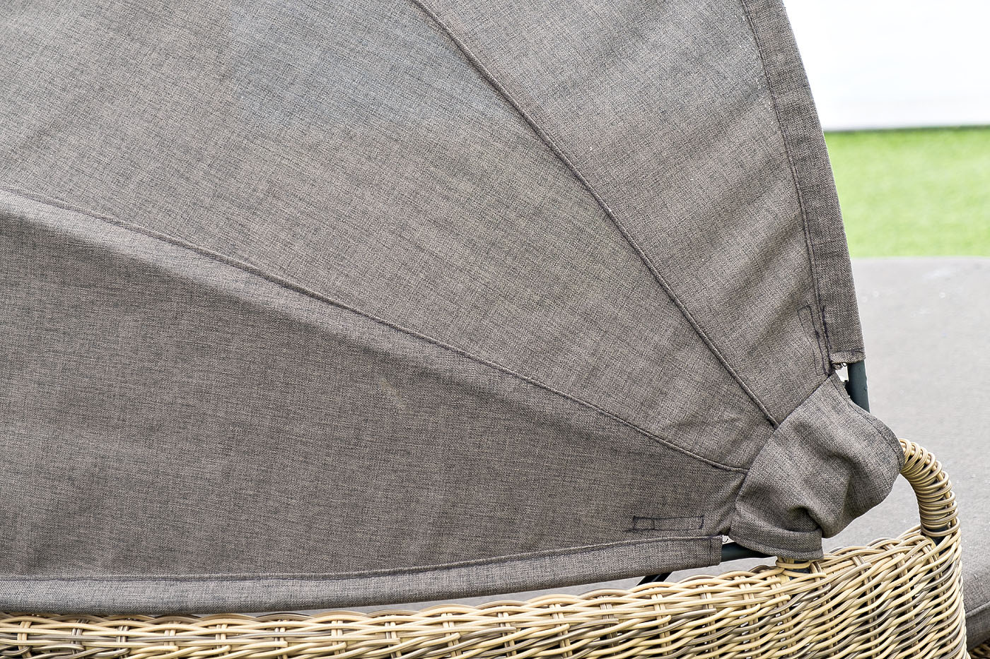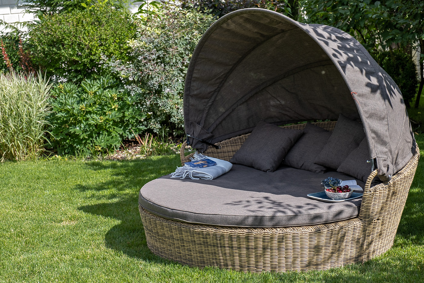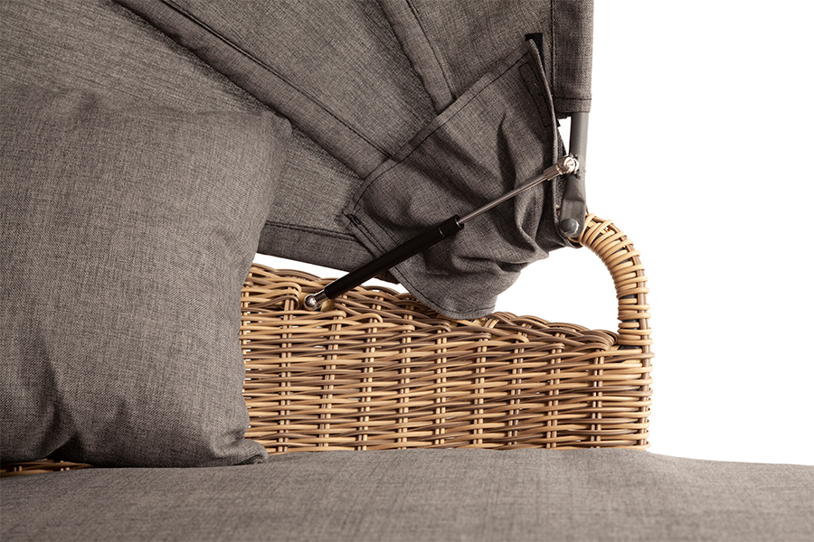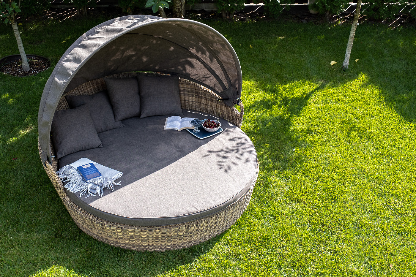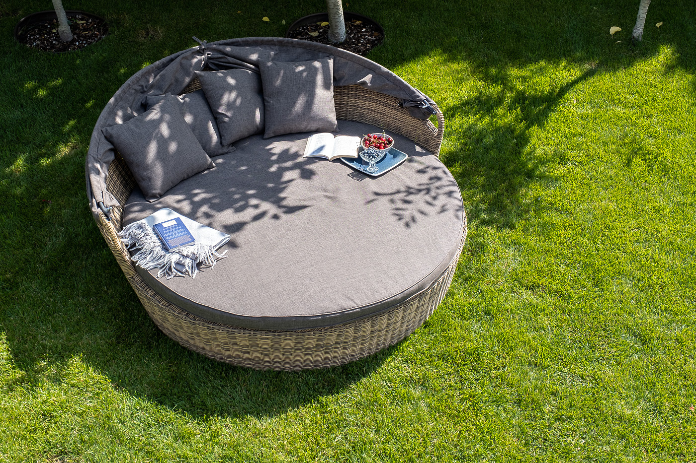 «Стильяно» - кровать из искусственного ротанга круглой формы. Она идеально подойдет для использования на открытом воздухе, в том числе и возле бассейна. Имеет соломенный оттенок. Данная модель имеет в основании прочный алюминиевый каркас, оплетенный вручную круглым ротангом и оснащена регулируемым козырьком, который ограничивает попадание солнечных лучей. Выполнен из водостойкой полиэфирной ткани. Мягкий матрас имеет съёмный чехол серого цвета состоящих из высококачественного полиэстера с водоотталкивающей пропиткой, подлежит машинной стирке. Диаметр кровати составляет 1850 мм, а высота 800 мм. Комплектацией предусмотрен набор из четырех серо-коричневых подушек - 450х450 мм и одного матраса - Ø1600 мм, высотой 60 мм.Бренд | 4SIS |
