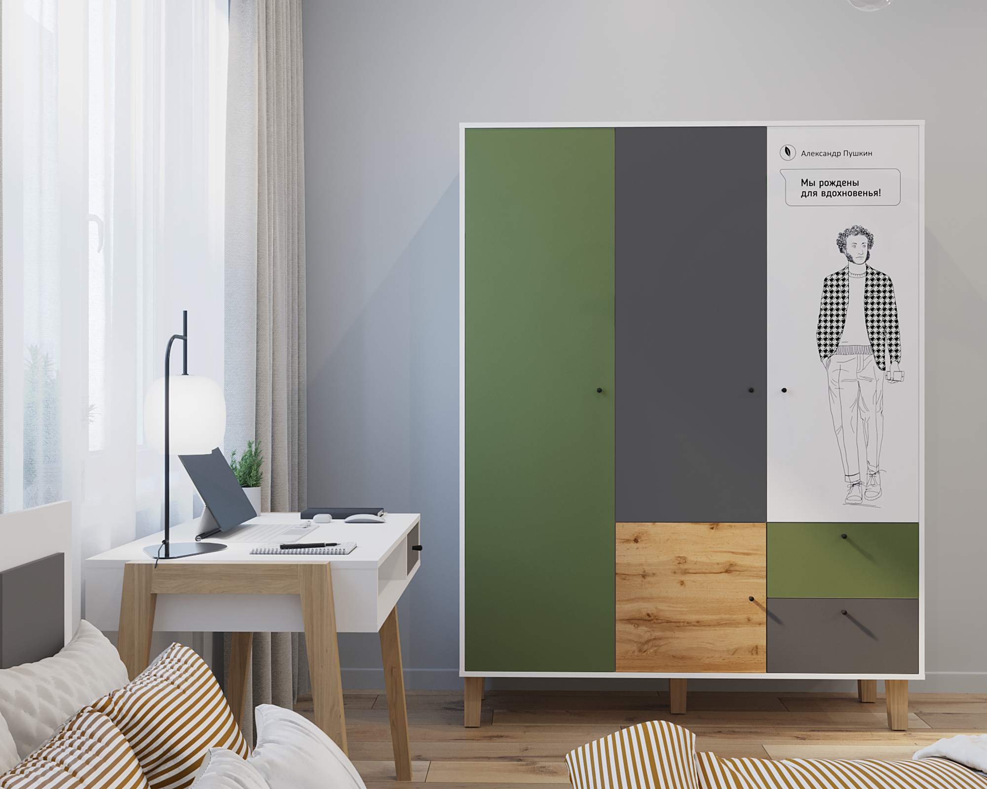 "Пушкин". Корпус и внутреннее наполнение - Белые, Фасады: Дуб Вотан, Белый с УФ-печатью "Пушкин", Олива, Темно-серый. Корпус и фасады из ЛДСП 16 мм, Опора сращенный массив Березы, высота - 18 см (5 шт) Направляющие телескопические, Ручка-кнопка черная пластик, Задняя стенка и дно ящика ХДФ врезная белая, Петля полунакладная с доводчиком."Характеристики