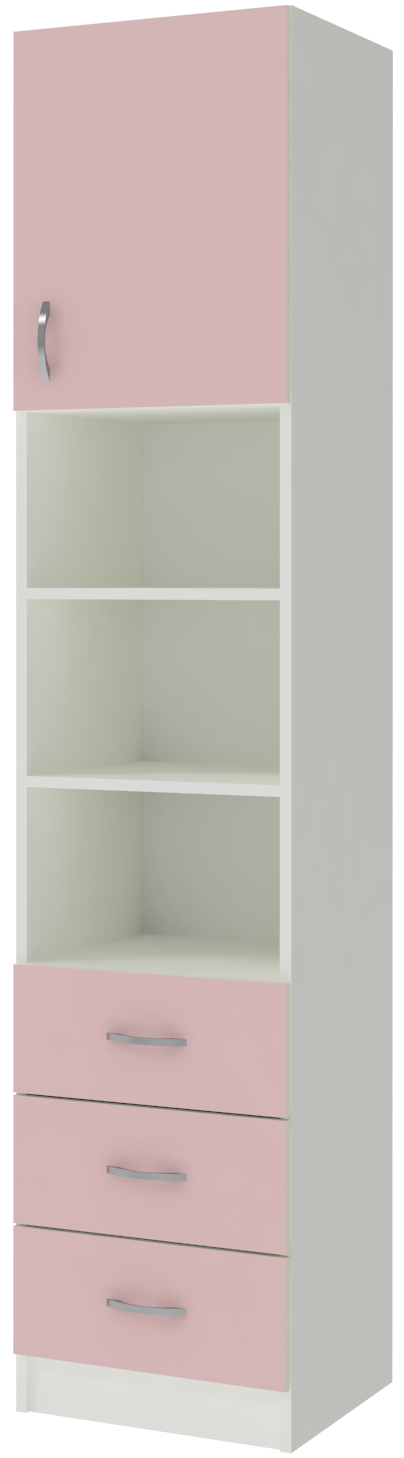 Сложно представить комнату, в которой живет ребенок, без шкафов, ведь детская – это место, которое выполняет множество функций: здесь ребенок отдыхает, спи, учится, играет, хранит свои вещи, делает уроки, проводит досуг. А значит, пространство детской комнаты должно быть организовано максимально эффективно, а каждый ее квадратный метр использован рационально. И для этих целей идеально подходит модульная детская мебель, составной частью комплектов которой является шкаф-пенал с открытой средней частью, верхним вместительным ящиком с распашной дверцей сверху и тремя выдвижным ящичками в нижней части. Модель производится в различных цветах: такой пенал можно купить и для мальчиков, и для девочек. На цветных фасадах светло-бежевая кромка. Благодаря своей конфигурации, полуоткрытый шкаф-пенал для детской отфабрики КарИВи станет функциональным и стильным предметом интерьера, ведь в нем можно не только разместить, спрятав различные предметы одежды, постельного белья или другие мелочи, но также всевозможные декоративные детали. На открытой полочке шкафа-пенала ребенок может разметить коллекции фигурок любимых героев или свои поделки.Характеристики