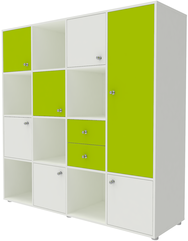 Стеллаж Джерри 2 - удобный, функциональный, красочный, оригинальный Размер всего стеллажа: 1600х1600х500мм. Шкаф1165х375х500мм. внутри расположена штанга. Материалы: Мебель изготовлена из ЛДСП. Борта декорированы противоударным кантом. У цветных фасадов светло-бежевая кромка. Модель универсальна - сторона определяется при сборке.Характеристики