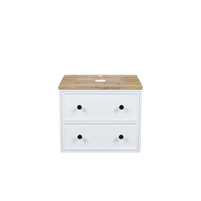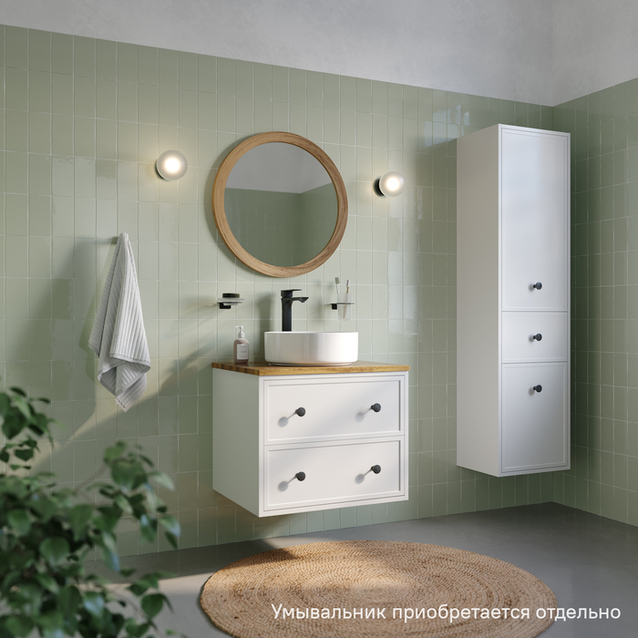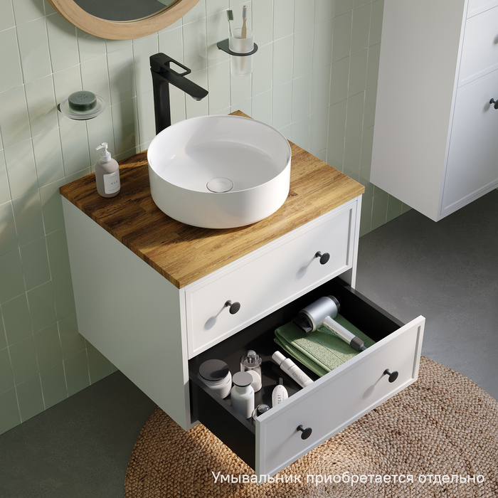 Компактная подвесная тумба Torr классического молочно-белого цвета со столешницей из клееного натурального дуба. Сочетает в себе узнаваемый стиль и практичность популярного скандинавского дизайна. Ее четкие формы, теплый цвет дерева, фасады с декоративной филенкой, круглые ручки смотрятся гармонично и впишутся в любой современный интерьер. Подойдет любой накладной умывальник, покупается отдельно. • Два просторных выдвижных ящика закрываются плавно и бесшумно благодаря высококачественным скрытым направляющим с доводчиками Hettich. Внутри ящики графитового цвета – стильно и практично. • Многослойное покрытие матовой эмалью, предназначенной для использования в помещениях с высокой влажностью, позволит сохранить первоначальный вид мебели надолго (при должном уходе). • Надежная фурнитура Hettich рассчитана на 30 000 открываний – это более 10 лет исправной работы. Гарантия на мебель IDDIS® – 3 года. (с) Авторский текст, сентябрь 2023 г.Инструкции