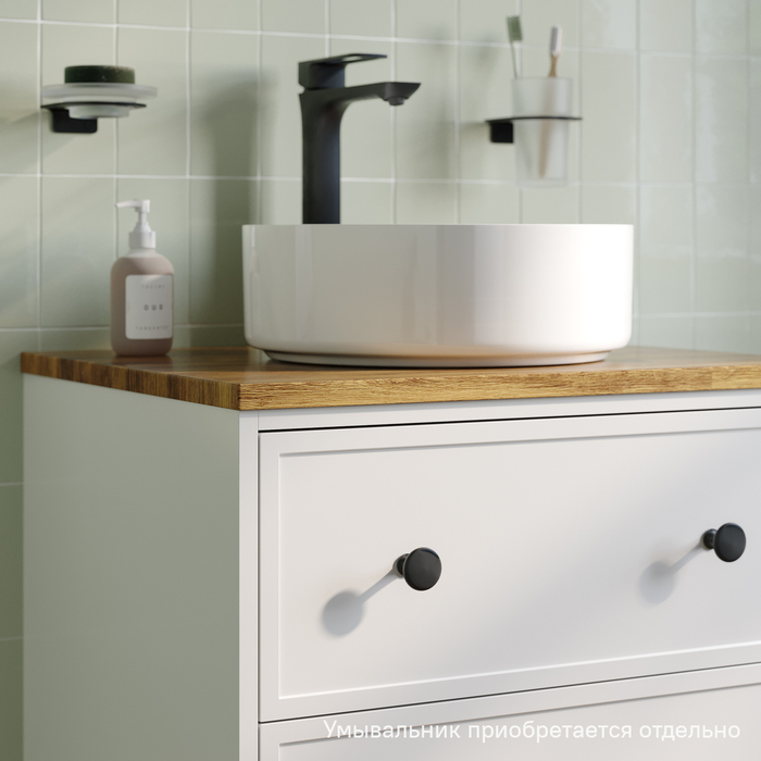 Чёрные матовые ручки, накладной умывальник, ящики с механизмом плавного доведения