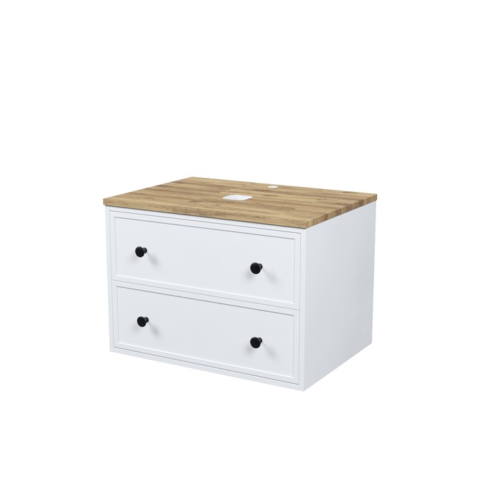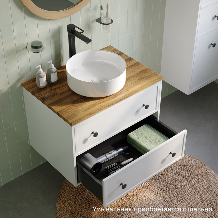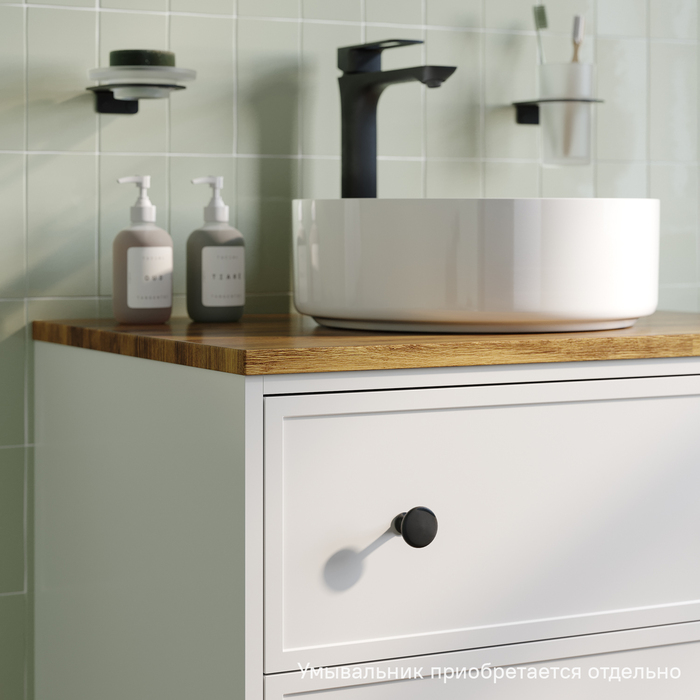 Компактная подвесная тумба Torr классического молочно-белого цвета со столешницей из клееного натурального дуба. Сочетает в себе узнаваемый стиль и практичность популярного скандинавского дизайна. Ее четкие формы, теплый цвет дерева, фасады с декоративной филенкой, круглые ручки смотрятся гармонично и впишутся в любой современный интерьер. Подойдет любой накладной умывальник, покупается отдельно. • Два просторных выдвижных ящика закрываются плавно и бесшумно благодаря высококачественным скрытым направляющим с доводчиками Hettich. Внутри ящики графитового цвета – стильно и практично. • Многослойное покрытие матовой эмалью, предназначенной для использования в помещениях с высокой влажностью, позволит сохранить первоначальный вид мебели надолго (при должном уходе). • Надежная фурнитура Hettich рассчитана на 30 000 открываний – это более 10 лет исправной работы. Гарантия на мебель IDDIS® – 3 года. (с) Авторский текст, сентябрь 2023 г.Инструкции