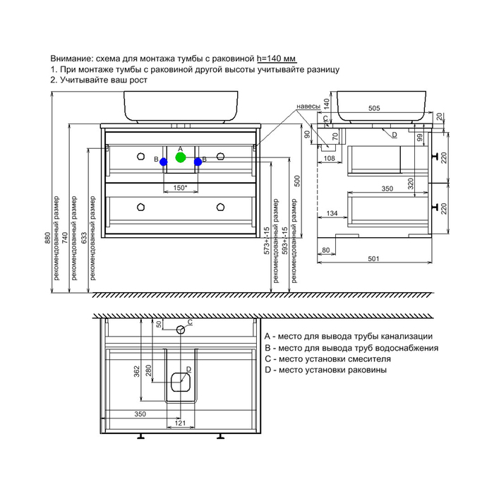 Чёрные матовые ручки, накладной умывальник, ящики с механизмом плавного доведения