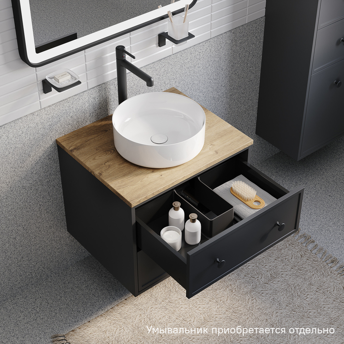 Чёрные матовые ручки, накладной умывальник, ящики с механизмом плавного доведения