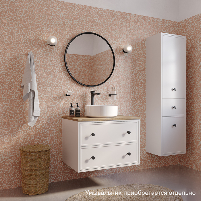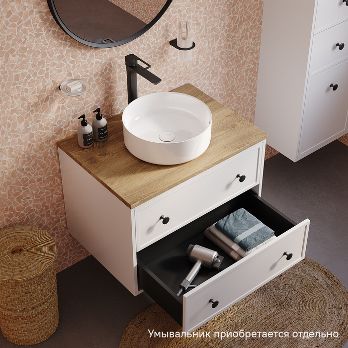Компактная подвесная тумба Torr классического молочно-белого цвета со столешницей из МДФ в оттенке дуба верона. Сочетает в себе узнаваемый стиль и практичность популярного скандинавского дизайна. Ее четкие формы, теплый цвет дерева, фасады с декоративной филенкой, круглые ручки смотрятся гармонично и впишутся в любой современный интерьер. Подойдет любой накладной умывальник, покупается отдельно. • Два просторных выдвижных ящика закрываются плавно и бесшумно благодаря высококачественным скрытым направляющим с доводчиками Hettich. Внутри ящики графитового цвета – стильно и практично. • Многослойное покрытие матовой эмалью, предназначенной для использования в помещениях с высокой влажностью, позволит сохранить первоначальный вид мебели надолго (при должном уходе). • Надежная фурнитура Hettich рассчитана на 30 000 открываний – это более 10 лет исправной работы. Гарантия на мебель IDDIS® – 3 года. (с) Авторский текст, декабрь 2023 г.Инструкции