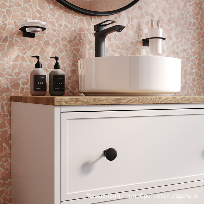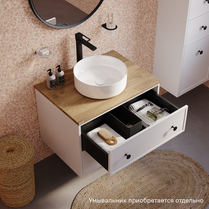 Чёрные матовые ручки, накладной умывальник, ящики с механизмом плавного доведения