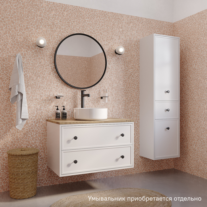 Чёрные матовые ручки, накладной умывальник, ящики с механизмом плавного доведения