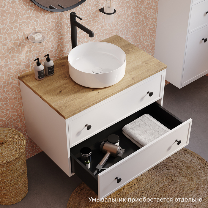 Вместительная подвесная тумба Torr классического молочно-белого цвета со столешницей из МДФ в оттенке дуба верона. Сочетает в себе узнаваемый стиль и практичность популярного скандинавского дизайна. Ее четкие формы, теплый цвет столешницы, фасады с декоративной филенкой, круглые ручки смотрятся гармонично и впишутся в любой современный интерьер. Подойдет любой накладной умывальник, покупается отдельно. • Два просторных выдвижных ящика закрываются плавно и бесшумно благодаря высококачественным скрытым направляющим с доводчиками Hettich. Внутри ящики графитового цвета – стильно и практично. • Многослойное покрытие матовой эмалью, предназначенной для использования в помещениях с высокой влажностью, позволит сохранить первоначальный вид мебели надолго (при должном уходе). • Надежная фурнитура Hettich рассчитана на 30 000 открываний – это более 10 лет исправной работы. Гарантия на мебель IDDIS® – 3 года. (с) Авторский текст, декабрь 2023 г.Инструкции