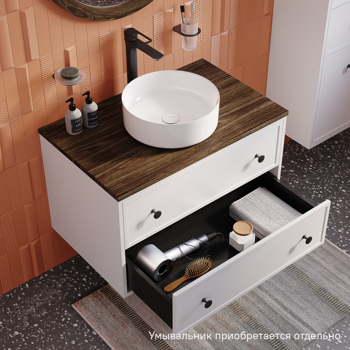 Вместительная подвесная тумба Torr классического молочно-белого цвета со столешницей из МДФ в оттенке ореха макадамия. Сочетает в себе узнаваемый стиль и практичность популярного скандинавского дизайна. Ее четкие формы, теплый цвет столешницы, фасады с декоративной филенкой, круглые ручки смотрятся гармонично и впишутся в любой современный интерьер. Подойдет любой накладной умывальник, покупается отдельно. • Два просторных выдвижных ящика закрываются плавно и бесшумно благодаря высококачественным скрытым направляющим с доводчиками Hettich. Внутри ящики графитового цвета – стильно и практично. • Многослойное покрытие матовой эмалью, предназначенной для использования в помещениях с высокой влажностью, позволит сохранить первоначальный вид мебели надолго (при должном уходе). • Надежная фурнитура Hettich рассчитана на 30 000 открываний – это более 10 лет исправной работы. Гарантия на мебель IDDIS® – 3 года. (с) Авторский текст, декабрь 2023 г.Инструкции