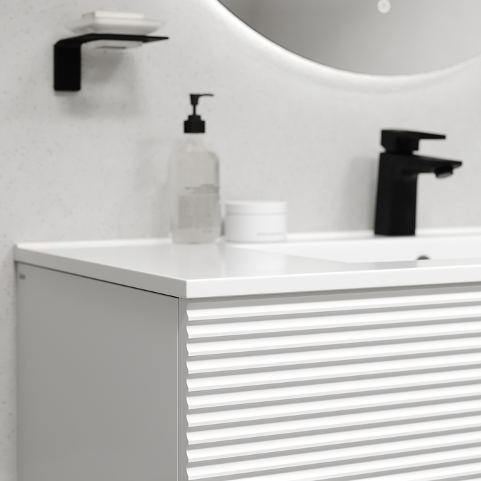 Вместительная подвесная тумба для ванной комнаты Bild с умывальником и выдвижными ящиками и полками – красивый дизайн с трендовой горизонтальной фрезеровкой в сочетании с универсальным белым цветом, удобством и практичностью. Материал фасадов – МДФ с покрытием ПВХ-пленкой. Она разработана для использования в помещениях с высокой влажностью и сохранит первоначальный вид мебели надолго (при должном уходе). Материал боковин – МДФ. Керамический умывальник с высоким бортом и большой вместительной чашей в комплекте. Удобен для гигиенических и хозяйственных нужд. Два ящика с направляющими скрытого монтажа с доводчиком и полки с распашной дверкой. Фурнитура рассчитана на более 10 лет исправной работы. Современный механизм открытия Push-to-Open – открывается нажатием на фасад. В комплекте крепеж для монтажа тумбы. Сифон приобретается отдельно. Подходят сифоны IDDIS® арт. 900BVG0010VD, 902BV750VD, 900B000010VD (выпуск приобретается отдельно). Гарантия на мебель IDDIS® – 3 года, на умывальник – 5 лет. (с) Авторский текст, март 2025 г.Инструкции