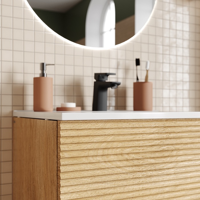 Компактная подвесная тумба для ванной комнаты Bild с умывальником и ящиками – красивый дизайн со структурной горизонтальной фрезеровкой в сочетании с теплым оттенком дуба, удобством и практичностью. - Материал фасадов – МДФ с покрытием ПВХ-пленкой. Она разработана для использования в помещениях с высокой влажностью и сохранит первоначальный вид мебели надолго (при должном уходе). Материал боковин – ЛДСП. - Керамический умывальник с высоким бортом и большой вместительной чашей в комплекте. Удобен для гигиенических и хозяйственных нужд. - Два ящика с направляющими скрытого монтажа. Фурнитура рассчитана на более 10 лет исправной работы. - Современный механизм открытия Push-to-Open – открывается нажатием на фасад. - В комплекте крепеж для монтажа тумбы. - Сифон приобретается отдельно. Подходят сифоны IDDIS® арт. 900BVG0010VD, 902BV750VD, 900B000010VD (выпуск приобретается отдельно). Гарантия на мебель IDDIS® – 3 года, на умывальник – 5 лет. (с) Авторский текст, июнь 2024 г.Инструкции