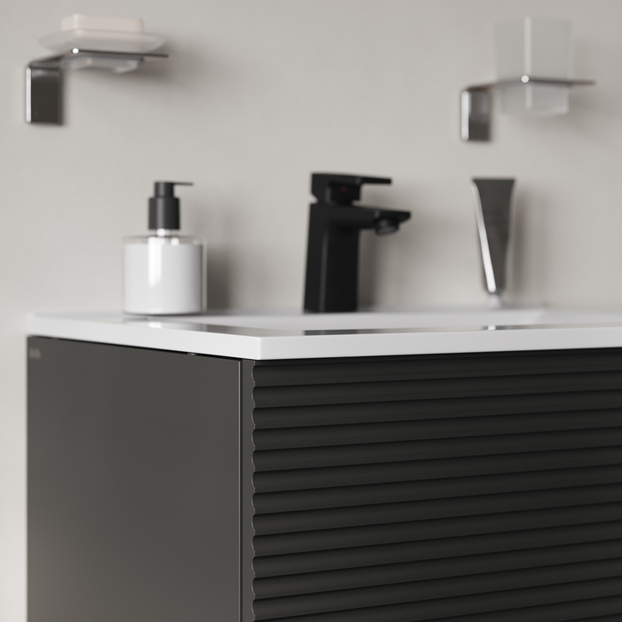 Компактная подвесная тумба для ванной комнаты Bild с умывальником и выдвижными ящиками – красивый дизайн с трендовой горизонтальной фрезеровкой в сочетании в сочетании с популярным темно-серым цветом, удобством и практичностью. • Материал фасадов – МДФ с покрытием ПВХ-пленкой. Она разработана для использования в помещениях с высокой влажностью и сохранит первоначальный вид мебели надолго (при должном уходе). Материал боковин – МДФ. • Керамический умывальник с высоким бортом и большой вместительной чашей в комплекте. Удобен для гигиенических и хозяйственных нужд. • Два ящика с направляющими скрытого монтажа. Фурнитура рассчитана на более 10 лет исправной работы. • Современный механизм открытия Push-to-Open – открывается нажатием на фасад. • В комплекте крепеж для монтажа тумбы. • Сифон приобретается отдельно. Подходят сифоны IDDIS® арт. 900BVG0010VD, 902BV750VD, 900B000010VD (выпуск приобретается отдельно). Гарантия на мебель IDDIS® – 3 года, на умывальник – 5 лет. (с) Авторский текст, октябрь 2024 г.Инструкции