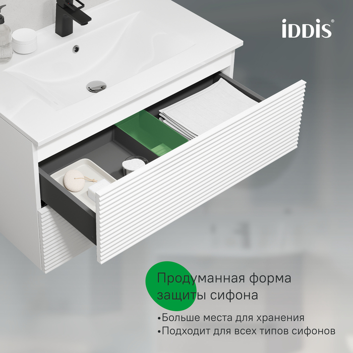 Вместительная подвесная тумба для ванной комнаты Bild с умывальником и выдвижными ящиками – красивый дизайн с трендовой горизонтальной фрезеровкой в сочетании с универсальным белым цветом, удобством и практичностью. • Материал фасадов – МДФ с покрытием ПВХ-пленкой. Она разработана для использования в помещениях с высокой влажностью и сохранит первоначальный вид мебели надолго (при должном уходе). Материал боковин – МДФ. • Керамический умывальник с высоким бортом и большой вместительной чашей в комплекте. Удобен для гигиенических и хозяйственных нужд. • Два ящика с направляющими скрытого монтажа. Фурнитура рассчитана на более 10 лет исправной работы. • Современный механизм открытия Push-to-Open – открывается нажатием на фасад. • В комплекте крепеж для монтажа тумбы. • Сифон приобретается отдельно. Подходят сифоны IDDIS® арт. 900BVG0010VD, 902BV750VD, 900B000010VD (выпуск приобретается отдельно). Гарантия на мебель IDDIS® – 3 года, на умывальник – 5 лет. (с) Авторский текст, октябрь 2024 г.Инструкции