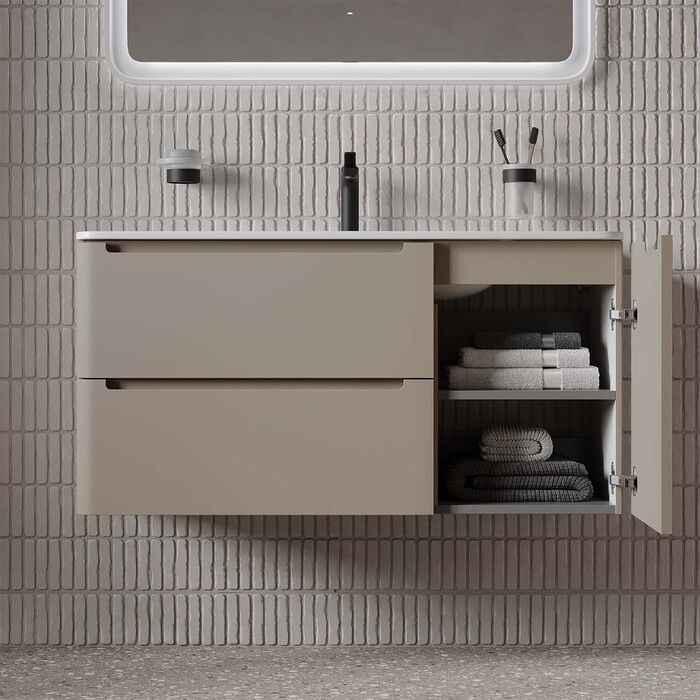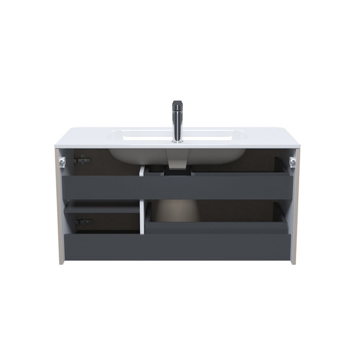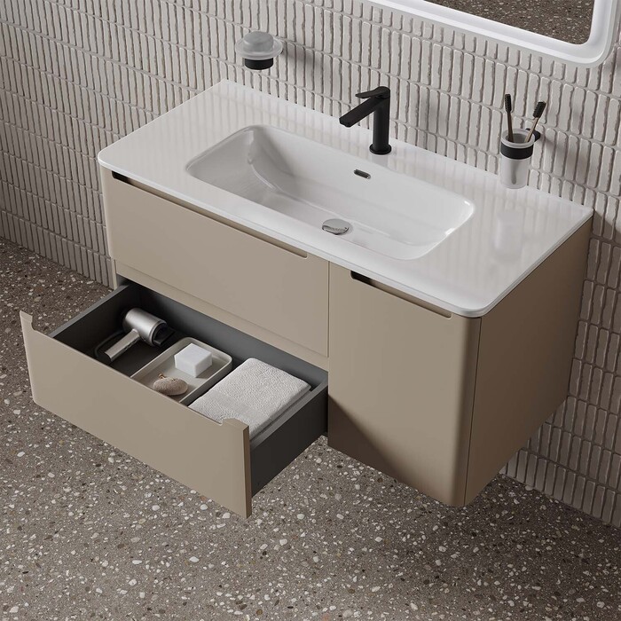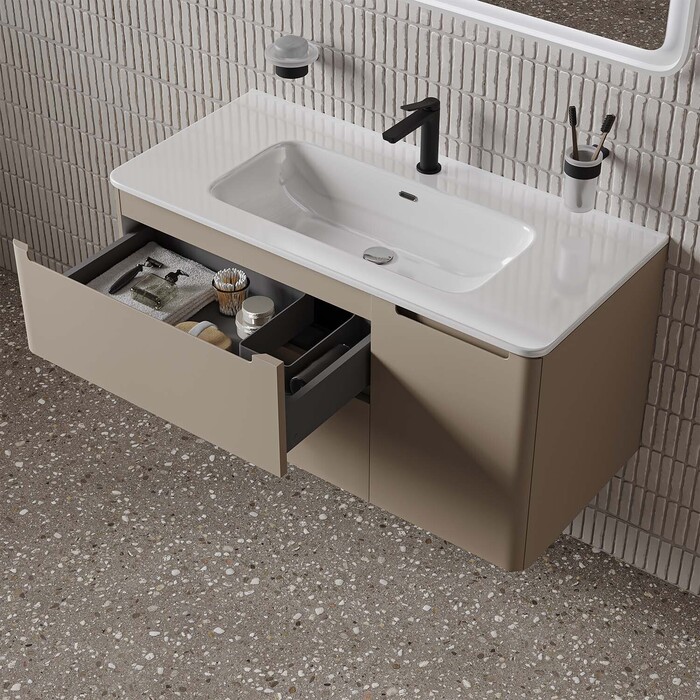 Интегрированные ручки, плоский умывальник, ящики с механизмом плавного доведения