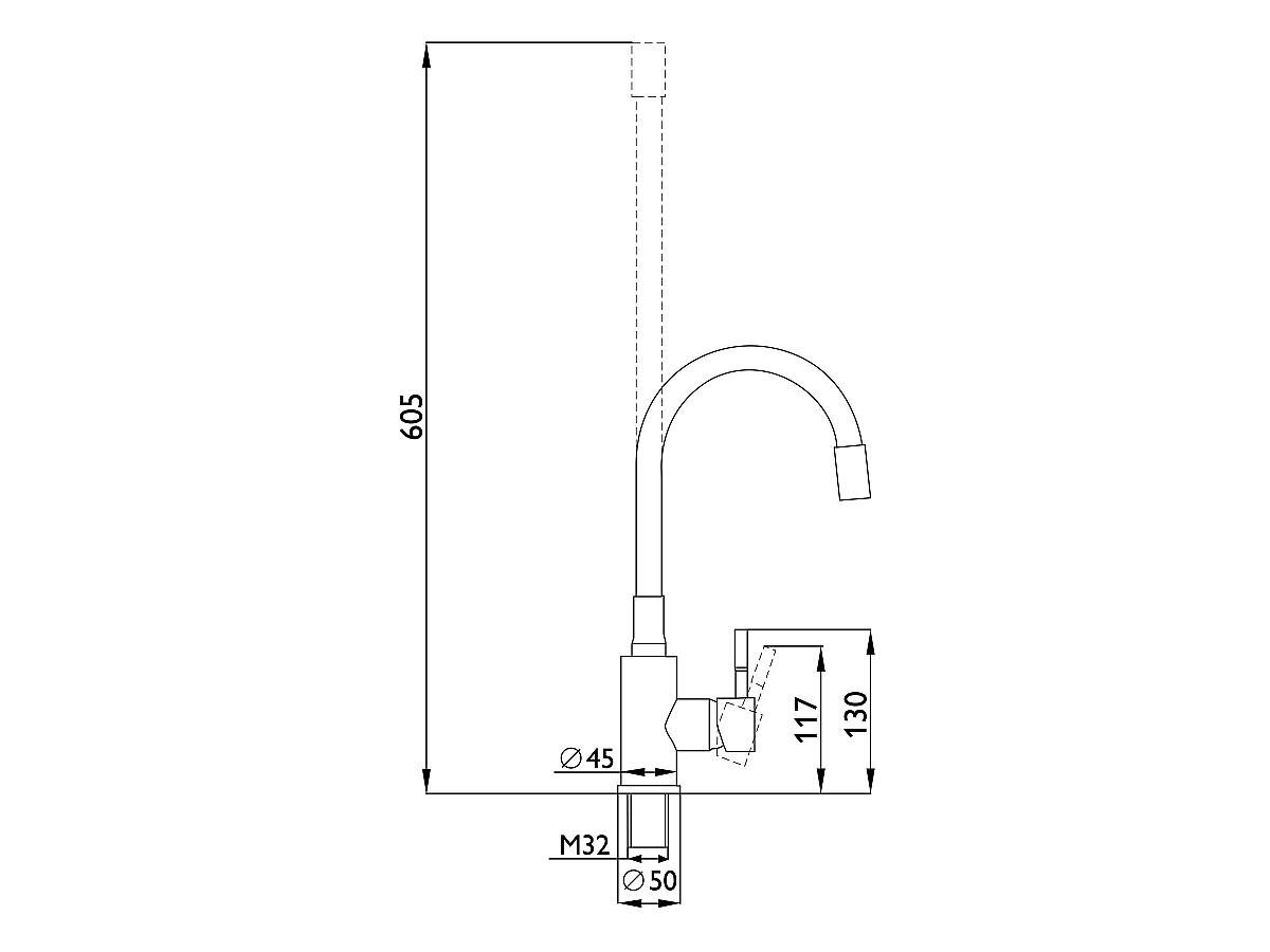Смеситель кухонный однорычажный с высоким поворотным изливом. Стандартное отверстие под смеситель. В комплект входит: гибкая подводка 50 см и крепление.Характеристики