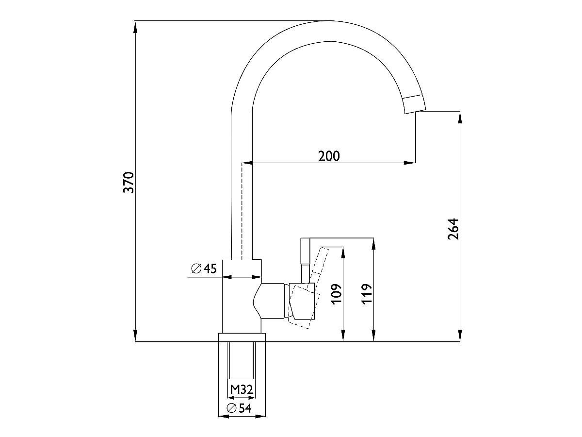 Смеситель кухонный однорычажный с высоким поворотным изливом. Стандартное отверстие под смеситель. В комплект входит: гибкая подводка 50 см и крепление.Характеристики