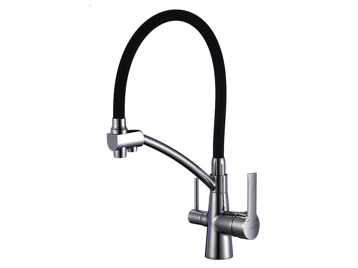 Смеситель кухонный двухрычажный с гибким изливом. Стандартное отверстие под смеситель. В комплект входит: гибкая подводка 40 см и крепление.Характеристики