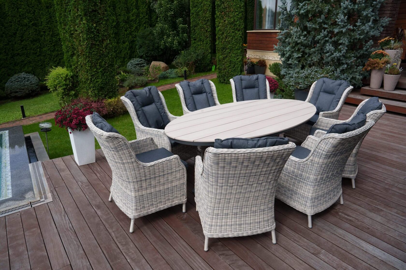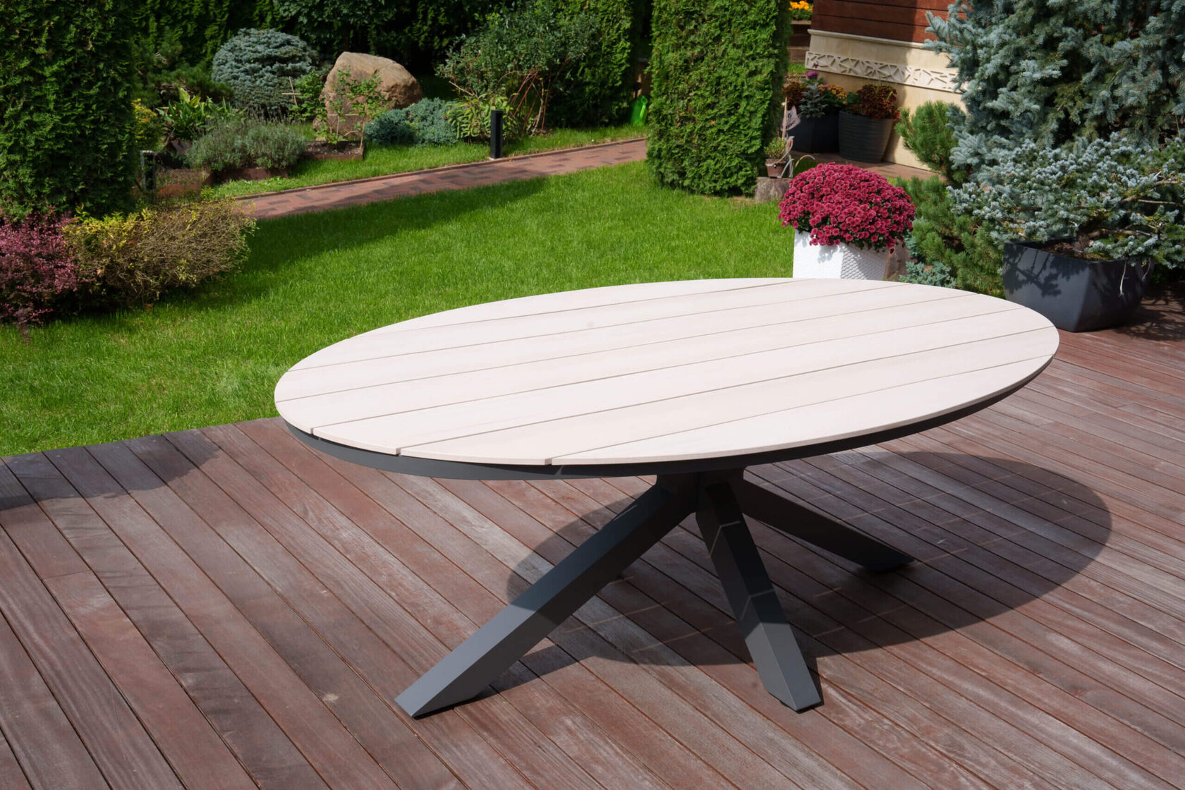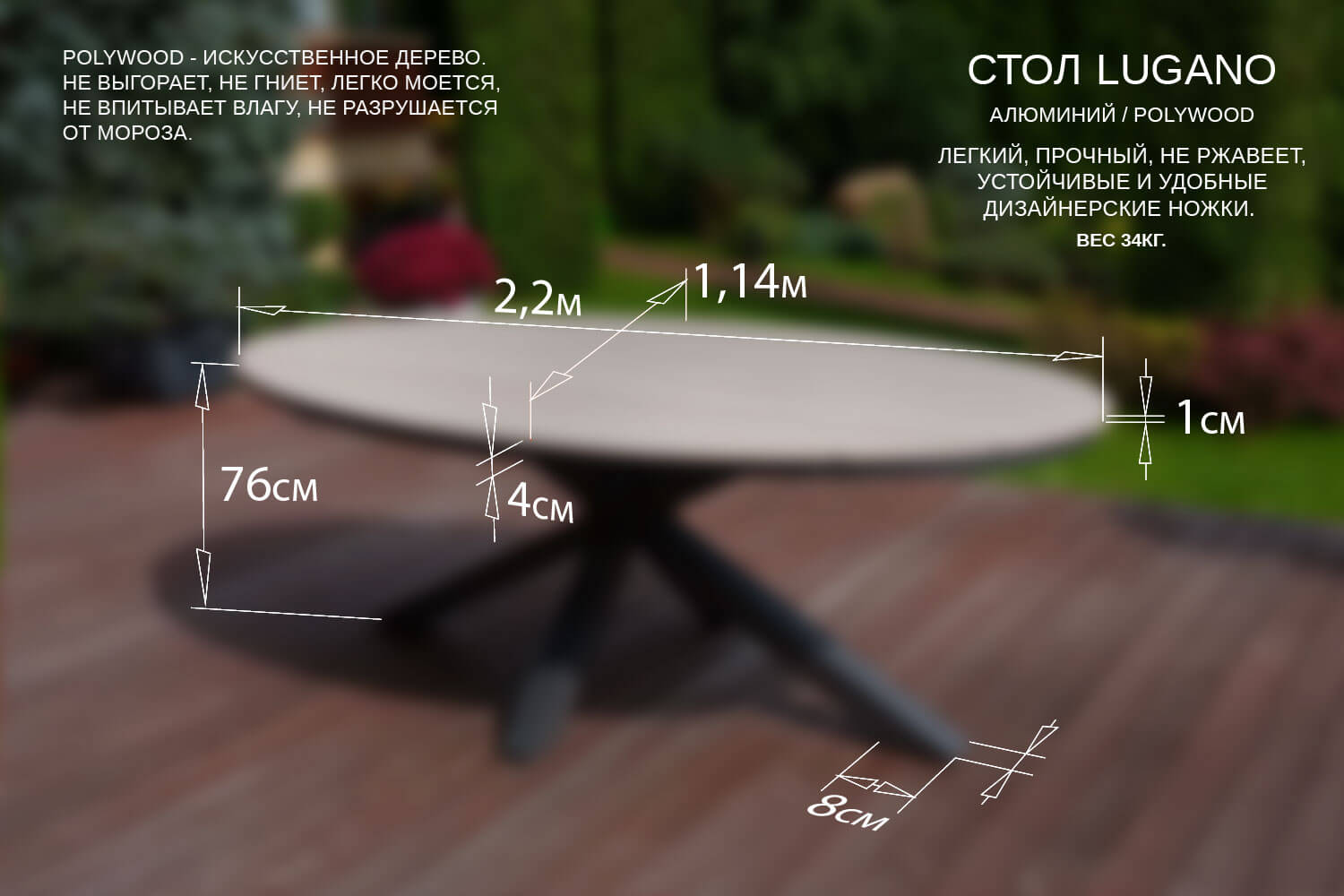 Стол ЛУГАНО овальный Стол имеет красивую текстуру дерева. Столешница изготовлена из древесно-полимерного материала polywood, каркас — алюминиевый. Стол ЛУГАНО можно устанавливать в самых разнообразных местах: на летних верандах, садовых площадок и под открытым небом – ему нипочем капризы природы. Столешница сделана их polywood — это инновационный и уникальный материал, а именно древесно-полимерный композит, изготовленный из переработанного пластика и древесных волокон. Бренд BESTA FIESTA выбирают потому, что мы не просто предлагаем красивую мебель — мы дарим возможность открыть новое качество отдыха. Материал: Алюминий Материал: Polywood Вид мебели: Столы и столики. Размер стола: 220*114*76см. Вес: 34кг. Материал: алюминиевый каркас / столешница polywood Цвет: светло-серый.Характеристики