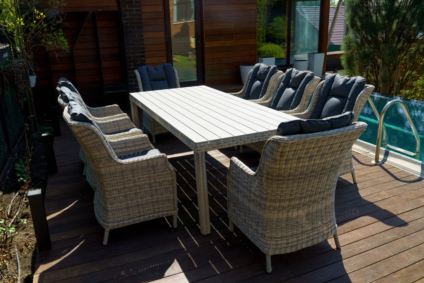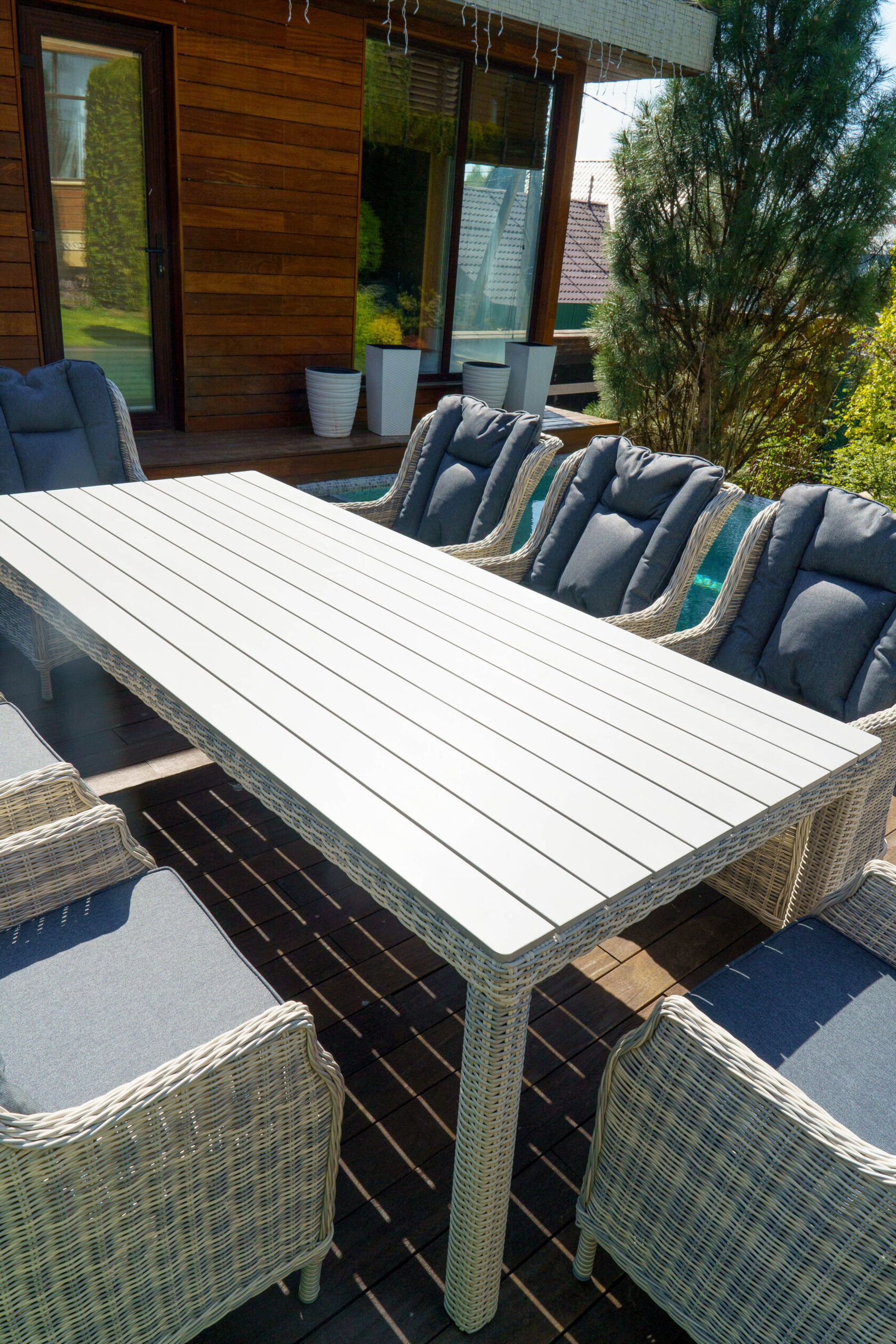 Обеденный стол ВЕНЕЦИЯ можно устанавливать в самых разнообразных местах: на летних верандах, садовых площадок и под открытым небом. Предоставляем Вам серию мебели «Венеция», которую можно комбинировать между собой и создавать свой собственный стиль в интерьере. Материал: Искусственный ротанг Вид мебели: Столы и столики ДxШxВ: 230x105x75 мм Размер: 230*105*76 см Вес: 45кг Материал: столешница — поливуд (искусственное дерево); каркас — искусственный ротанг/алюминий Цвет: серый Комплектация: 1шт - стол, болты.Характеристики