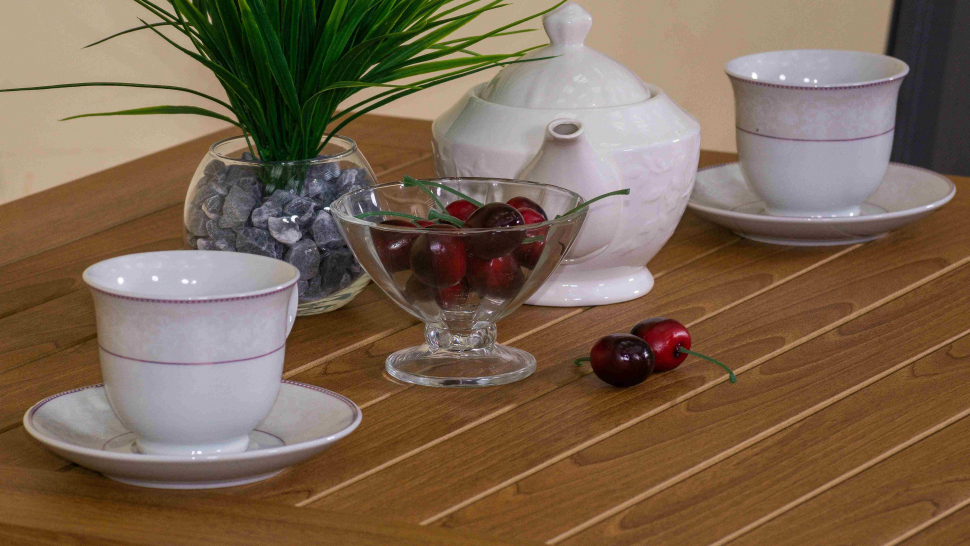 Материалы: каркас - всесезонный алюминий с порошковым напылением, столешница - поливуд (древесно-полимерный композит)