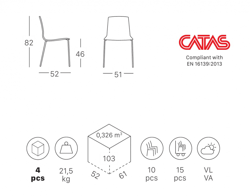 Пластиковый стулAliceс корпусом из технополимера от дизайнеров Arter & Citton на каркасе Ø16 мм с 4 ножками с различной отделкой. Характерные эргономичные линии корпуса иконтраст между его непрозрачной передней и глянцевой задней частью являются особенностью этой модели. Данная модель подходит для использования в помещении и на открытом воздухе (кроме моделей с хромированным каркасом). Возможные цвета корпуса: лен (11), тортора (15), красный (42), антрацит (81), светло-серый (82). Варианты отделки каркаса: хромированный, лен (VL), антрацит (VA). Данная модель доступна также в огнестойкой версии (IG). Посмотреть технические характеристики. Обращаем ваше внимание, что каждый цвет каркаса сочетается только с определенными цветами корпуса. При выборе цветовой комбинацииориентируйтесь на таблицу с палитрой, где указаны доступные варианты сочетаний.Характеристики