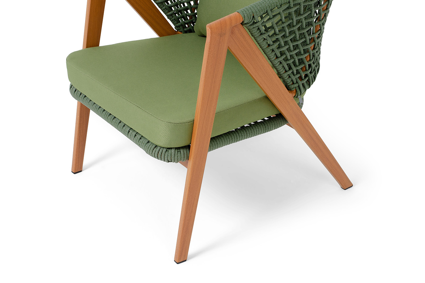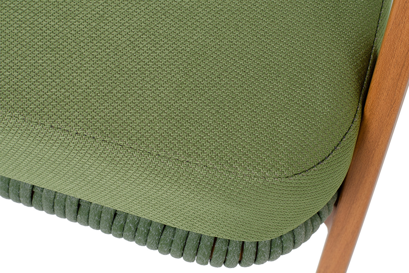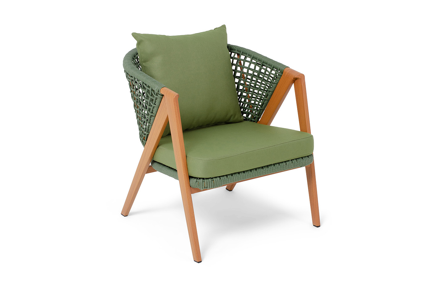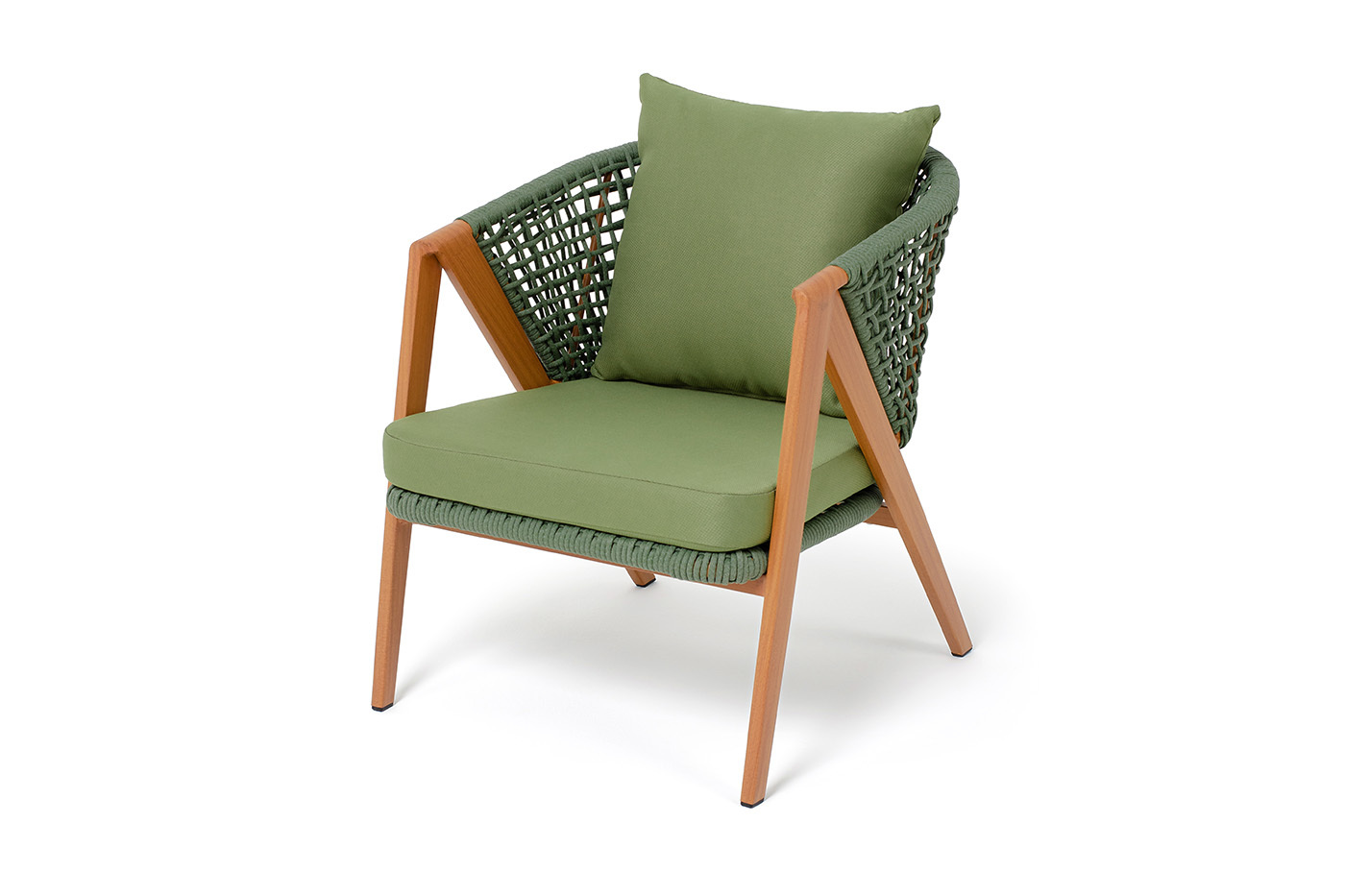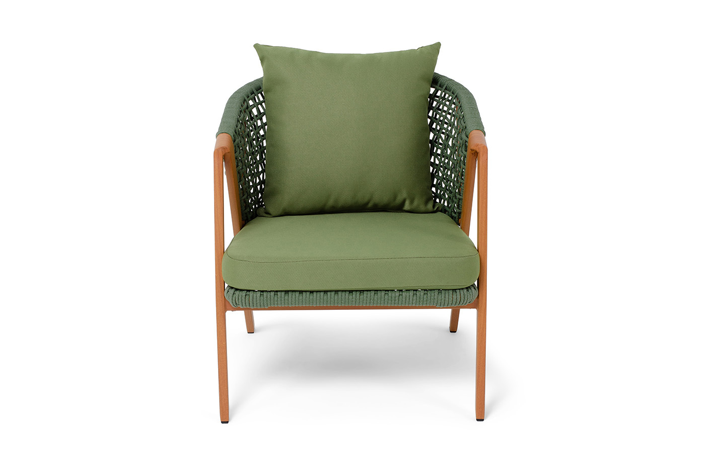 Плетеное кресло «Амстердам» для обустройства обеденной или лаунж-зоны. Изготовлен из алюминиевого каркаса, оплетенного вручную эластичными синтетическими лентами из высокопрочных полиэфирных волокон. Роуп является гипоаллергенным, прочным, износостойким и устойчивым к ультрафиолету. Приятный на ощупь и напоминает шерстяное плетение. Цвет каркаса – «под дерево», оплетки - зеленый. На ножках стула идут черные пластиковые наконечники (заглушки). Подушки состоят из наполнителя и съёмных чехлов, которые обработаны влагоотталкивающей пропиткой зеленого цвета. Чехол можно стирать в стиральной машине с использованием порошков. Размеры плетеного кресла: 640×770×735 мм.Бренд | 4SIS |