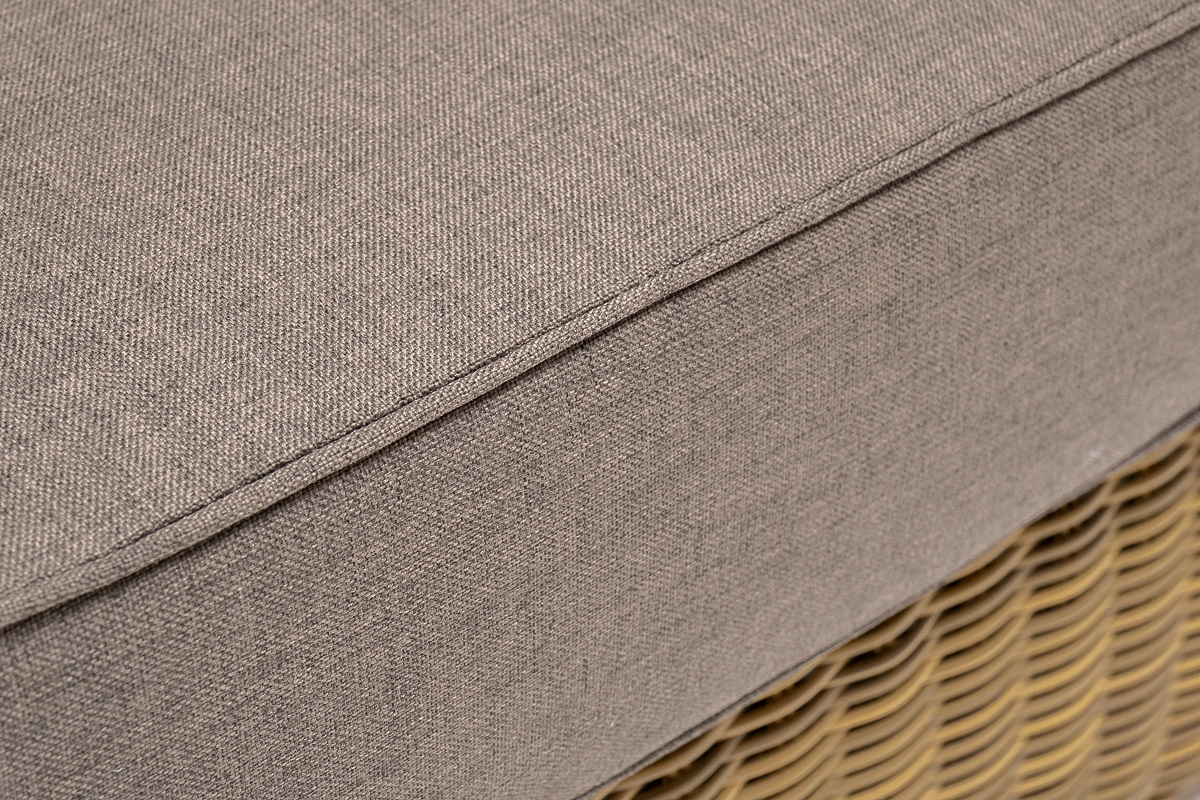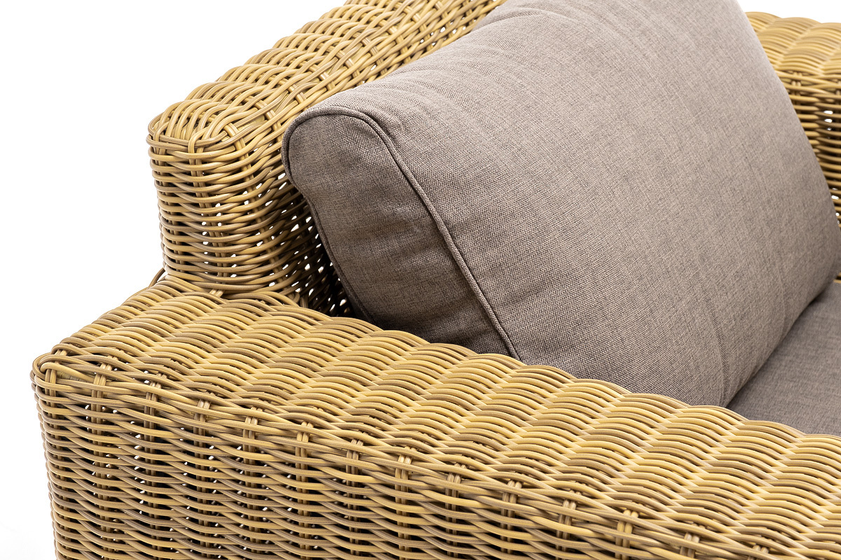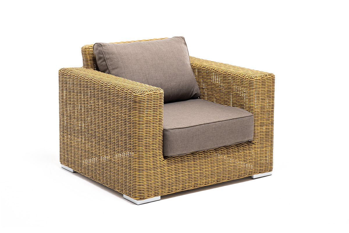 Кресло из искусственного ротанга «Боно» станет прекрасным дополнением к месту отдыха. Кресло оснащено каркасом из прочного алюминия, ручное круглое плетение является основным декоративным элементом мебели. Оно выполнено из искусственного ротанга в соломенном цвете. В комплектацию входят мягкие подушки для комфортного расположения. Чехлы съёмные серого цвета из высококлассного полиэстера с плотностью 300гр/м2. Габариты модели составляют 1000×900×775 мм, толщина подушки: 150 мм, вес: 23 кг.Бренд | 4SIS |