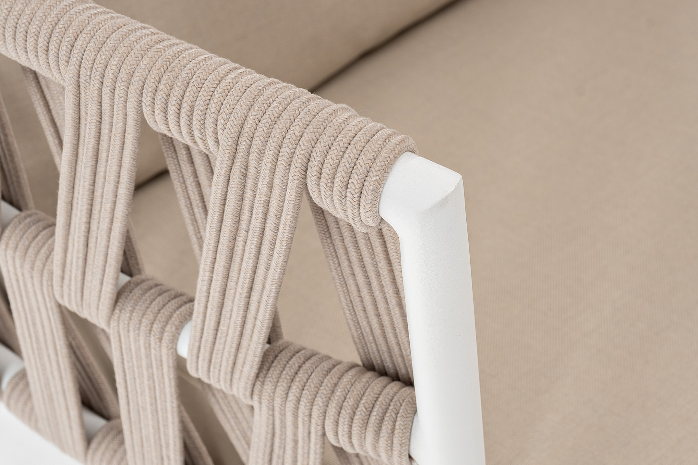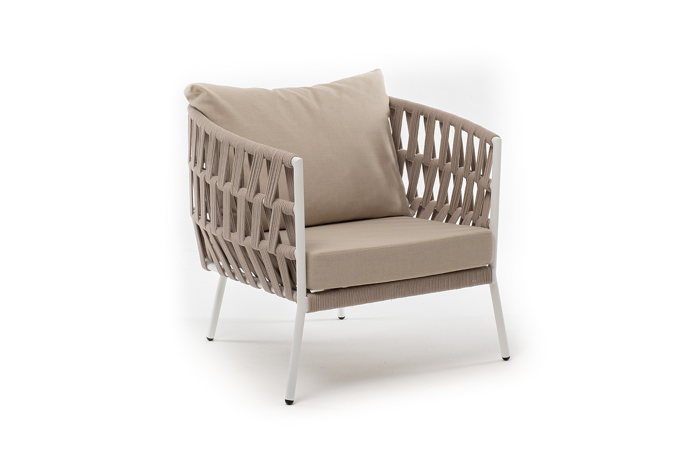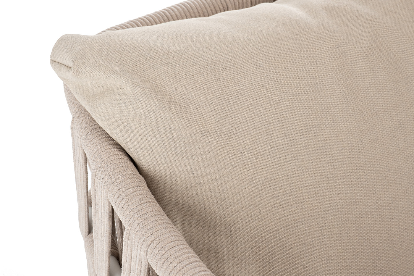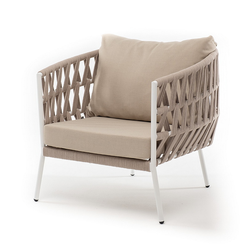 Плетеное кресло «Диего» с подушками в комплекте. Кресло имеет алюминиевый каркас, окрашенный порошковой краской в белый цвет. Боковины каркаса вручную оплетены роупом - эластичными синтетическими лентами, изготовленными из высокопрочных полиэфирных волокон. Цвет оплетки - бежевый. Подушки состоят из наполнителя и съёмных чехлов, которые обработаны влагоотталкивающей пропиткой бежевого цвета. Чехол можно стирать в стиральной машине с использованием порошков. Размер кресла: 770×720×770 мм.Бренд | 4SIS |