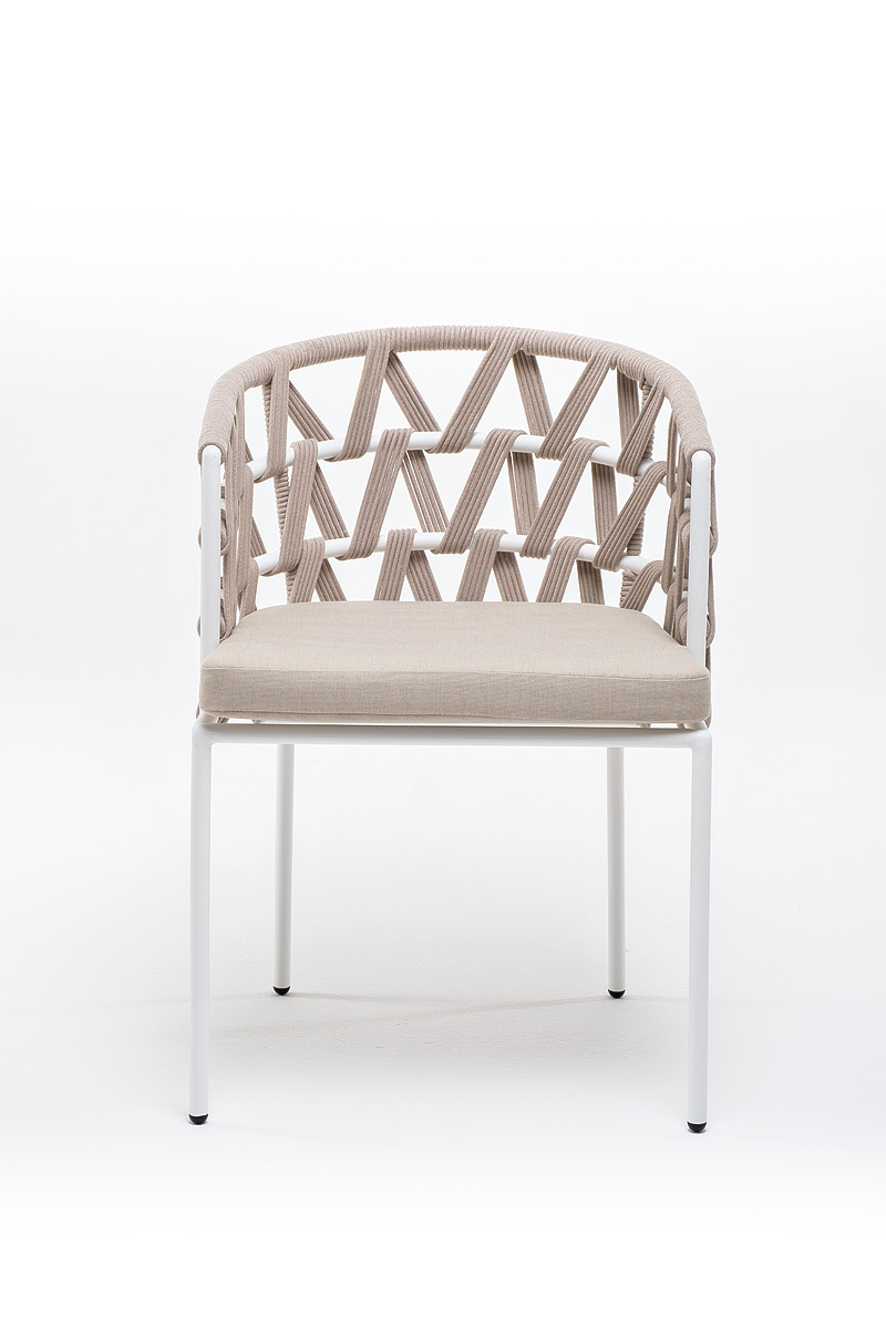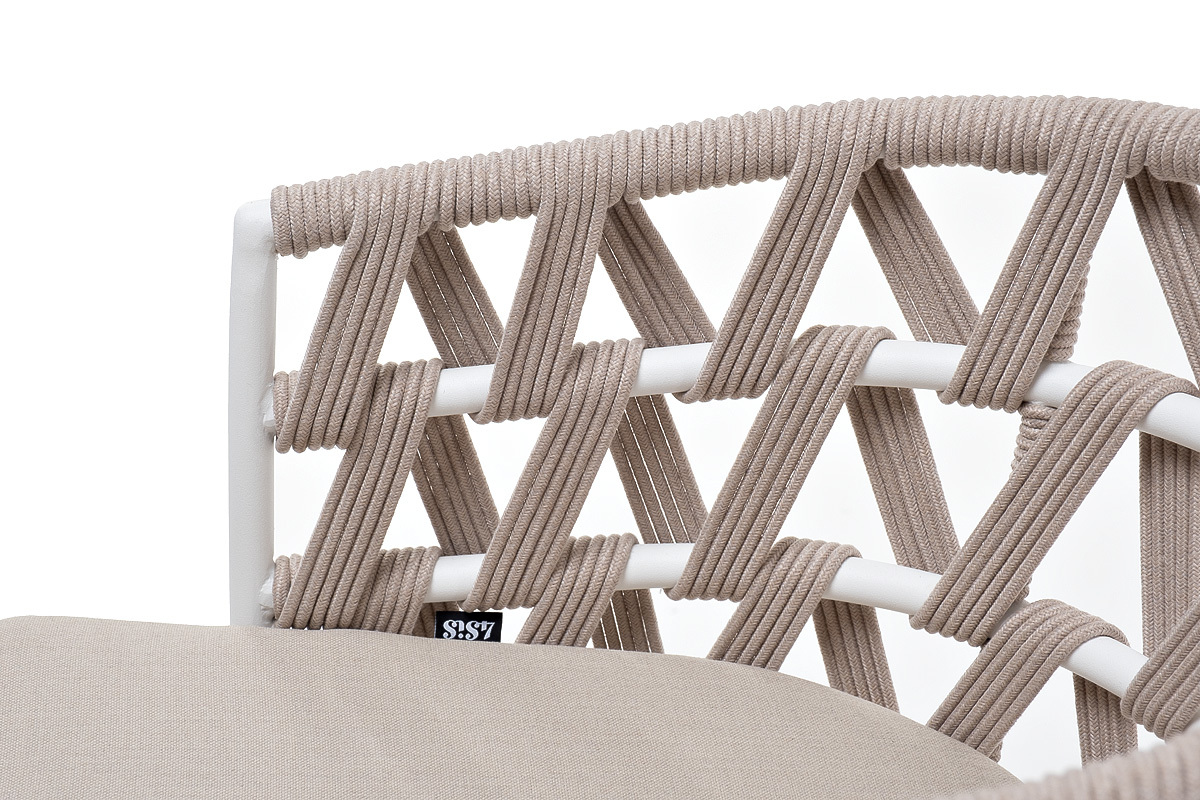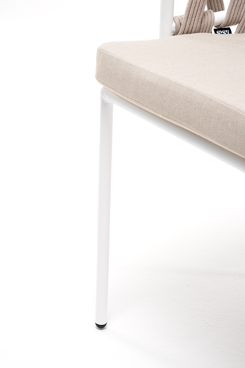 "Диего" стул плетеный из роупа, каркас из стали белый муар, роуп бежевый круглый, ткань бежевая 052