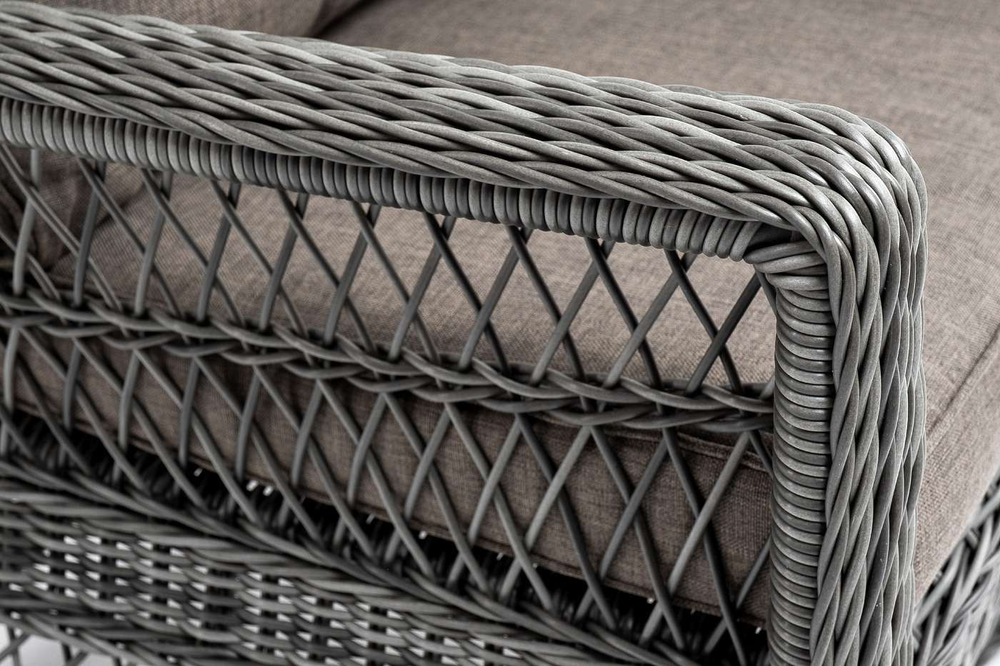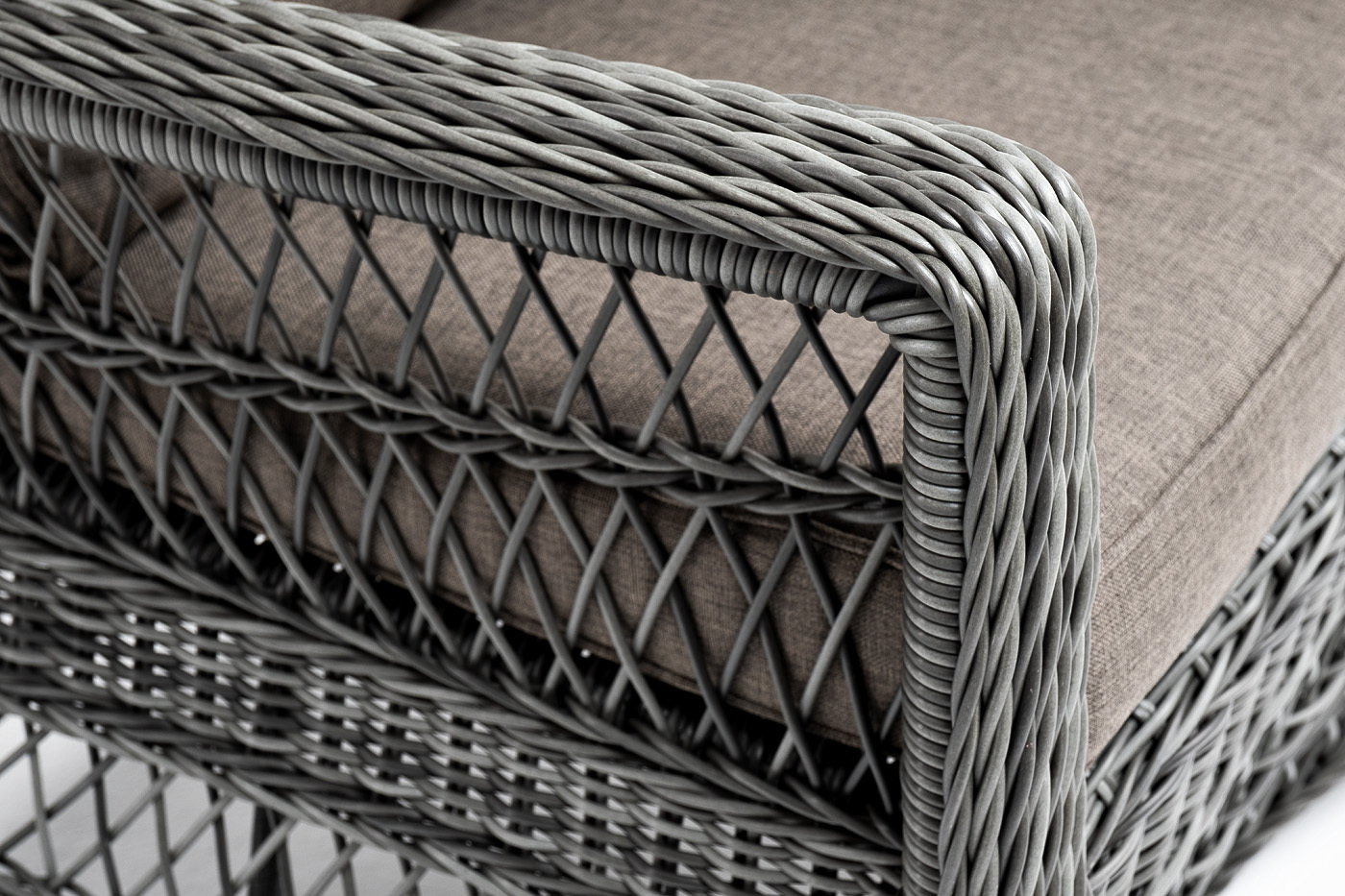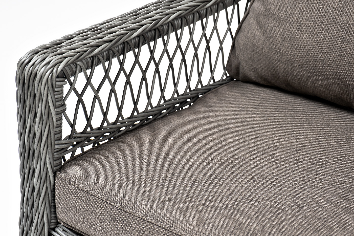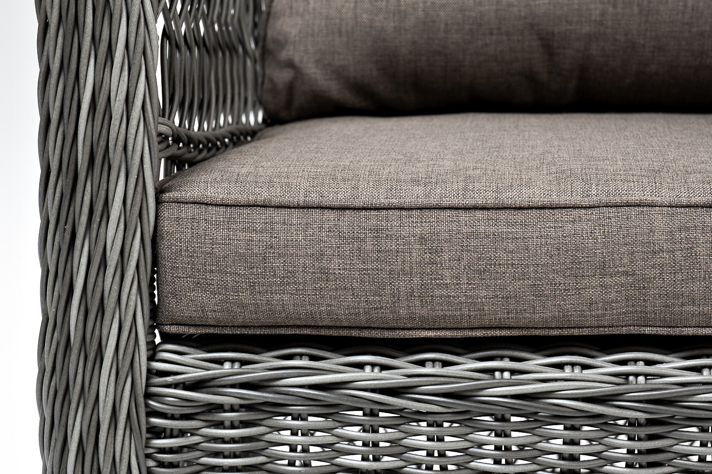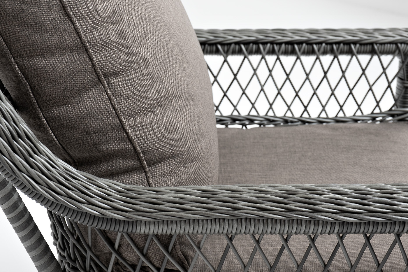 Кресло «Гранд Латте» имеет практичные подлокотники для удобного размещения во время отдыха. Размер модели – 720×830×850 мм. Кресло изготовлена из устойчивого алюминиевого каркаса. Искусственный ротанг украшает мебель в качестве круглого ручного плетения. Оно представлено в цвете "графит". Укомплектовано плетеное кресло удобными мягкими подушками, одна из которых располагается в области спинки. Они выполнены в сером оттенке. При пошиве тканевых изделий используется полиэстер, плотностью 300гр/м2. Он в обязательном порядке проходит обработку влагоотталкивающей пропиткой.Бренд | 4SIS |