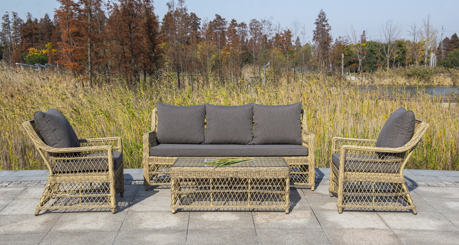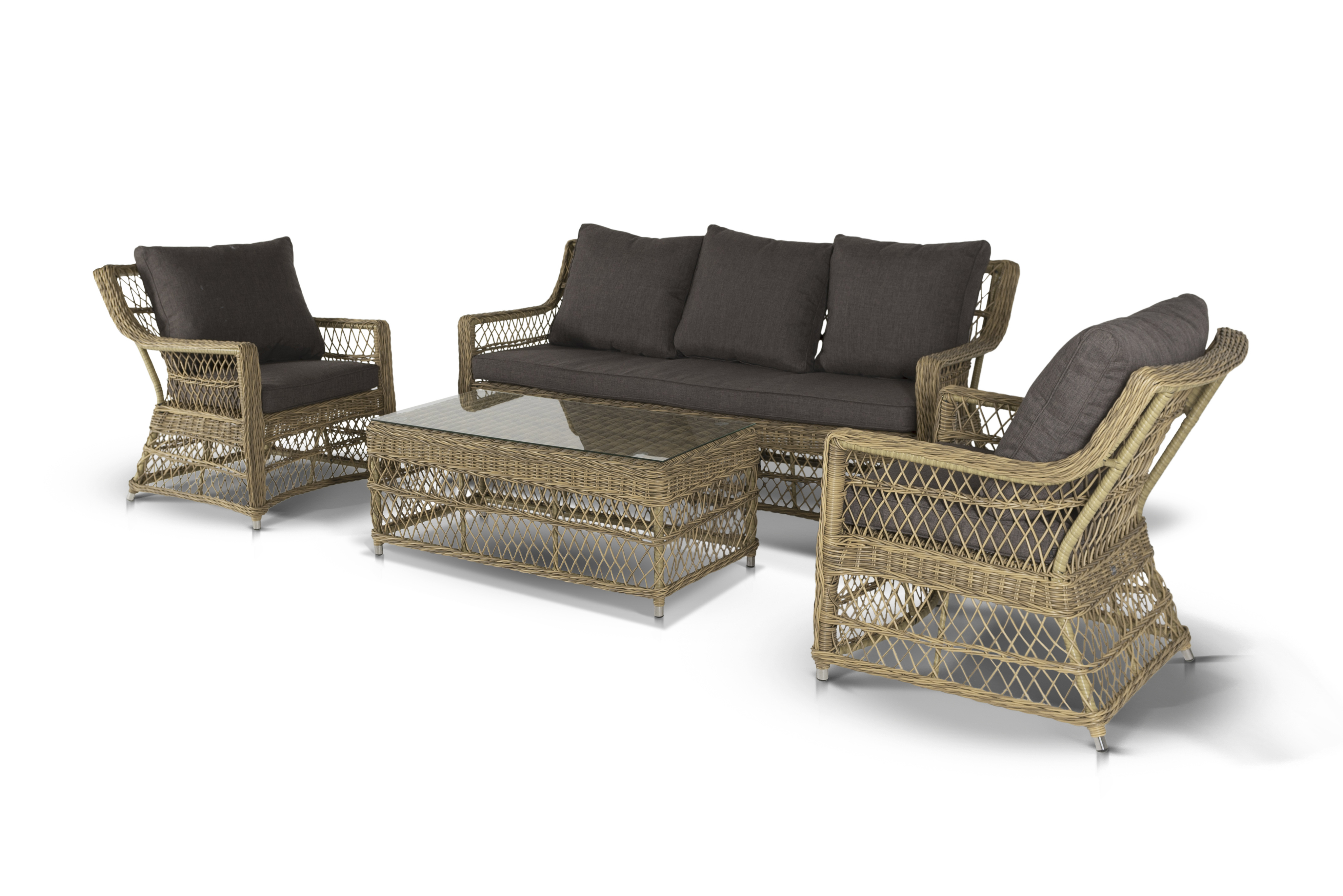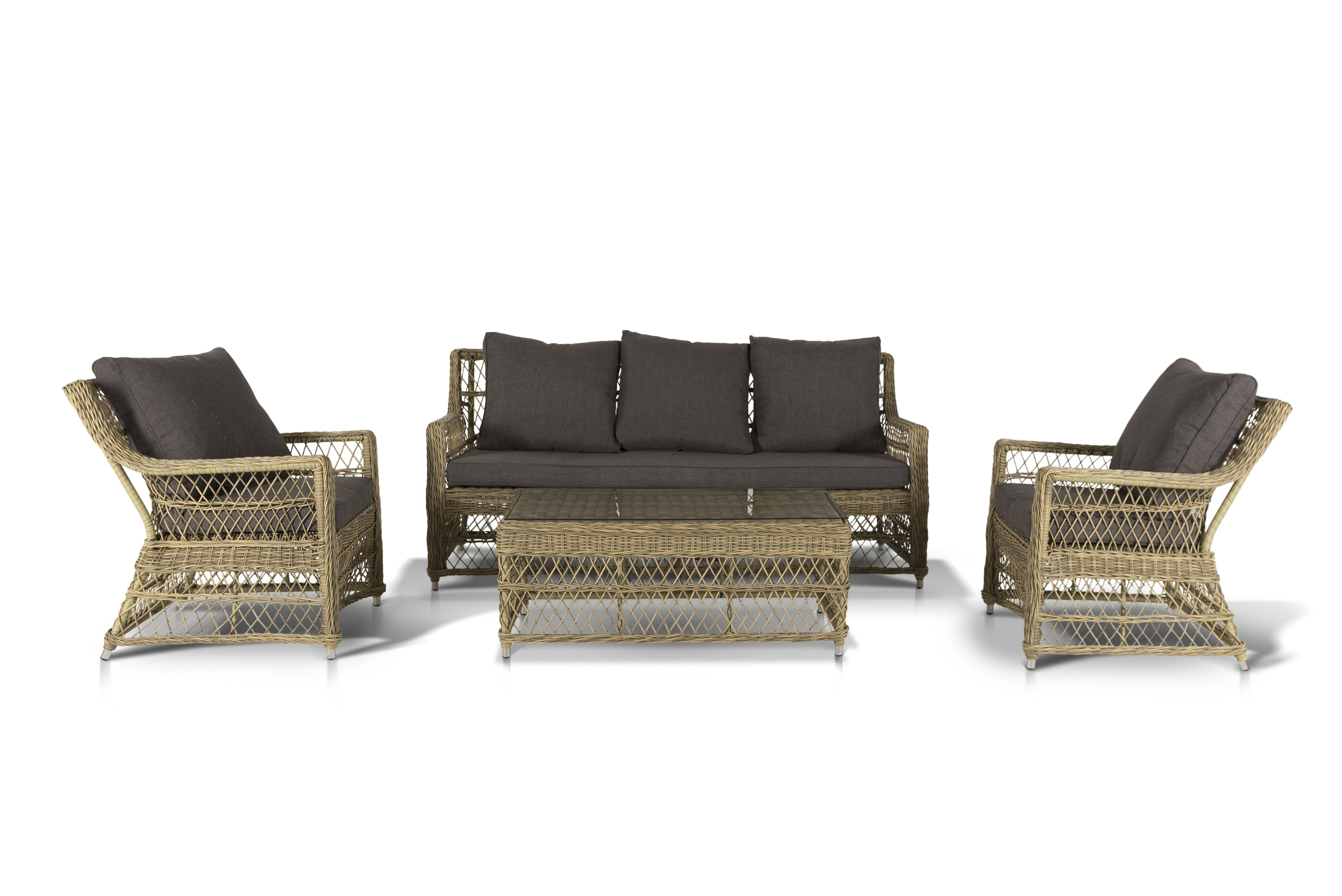 Кресло «Гранд Латте» имеет практичные подлокотники для удобного размещения во время отдыха. Размер модели – 720×830×850 мм. Кресло изготовлена из устойчивого алюминиевого каркаса. Искусственный ротанг украшает мебель в качестве круглого ручного плетения. Оно представлено в соломенном цвете. Укомплектовано плетеное кресло удобными мягкими подушками, одна из которых располагается в области спинки. Они выполнены в сером оттенке. При пошиве тканевых изделий используется полиэстер, плотностью 300гр/м2. Он в обязательном порядке проходит обработку влагоотталкивающей пропиткой.Бренд | 4SIS |