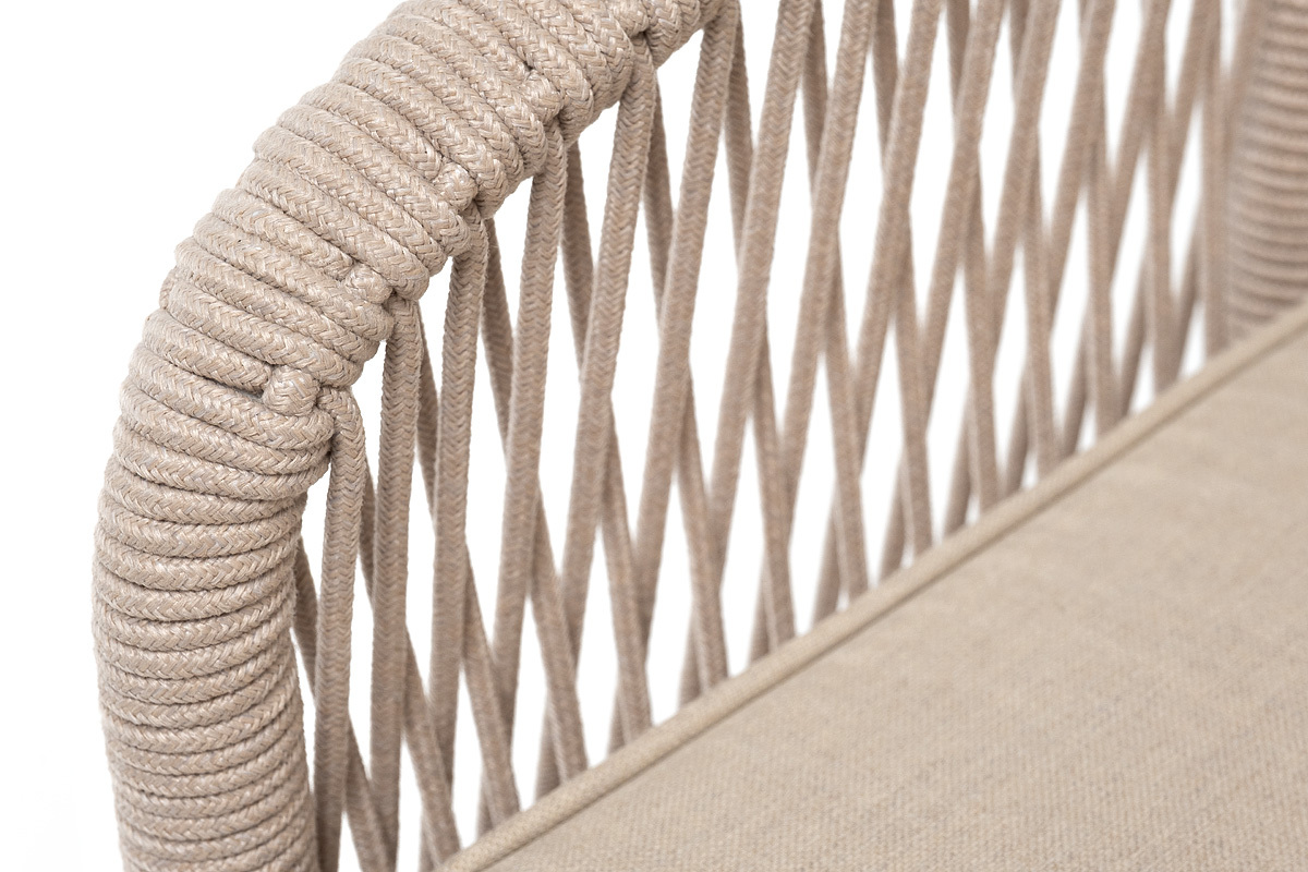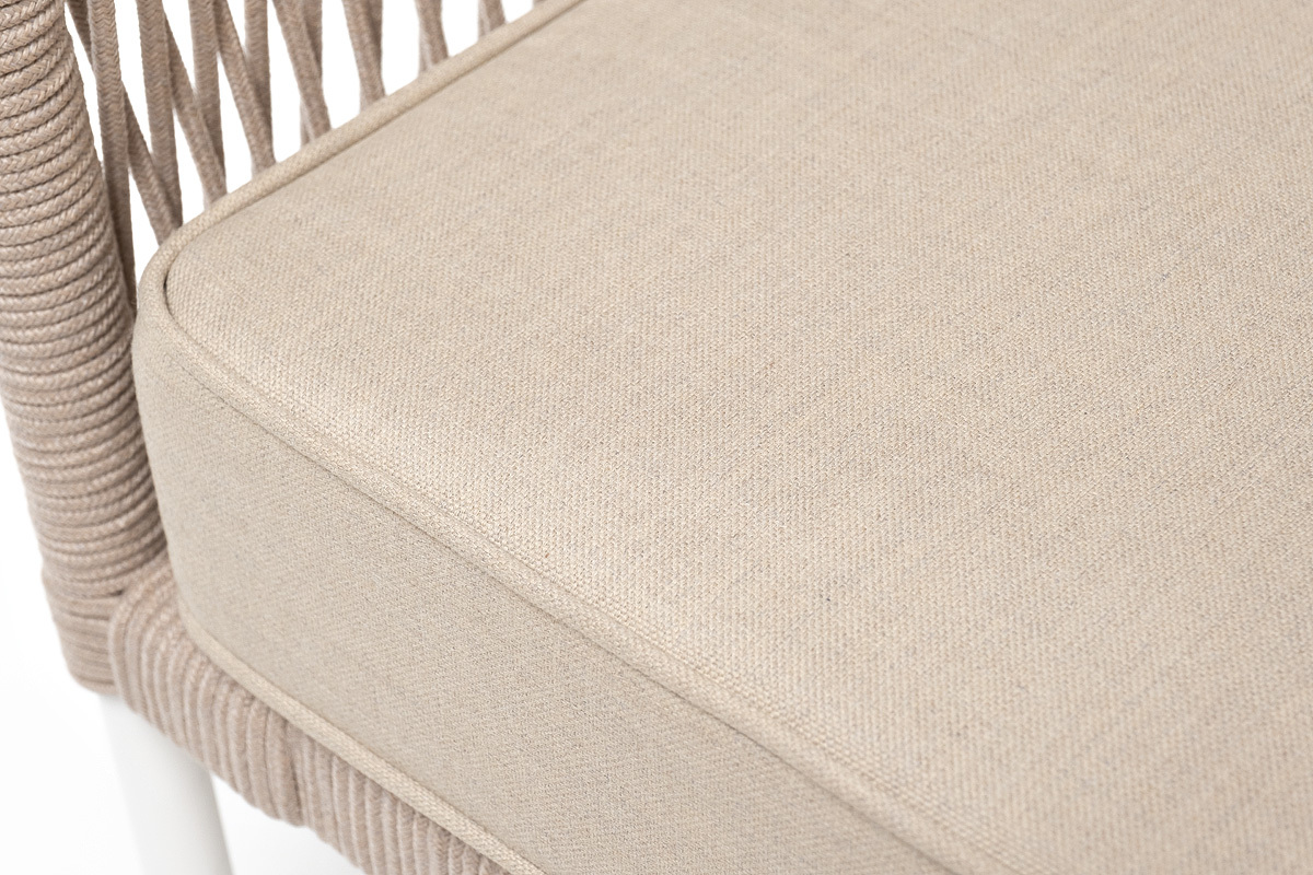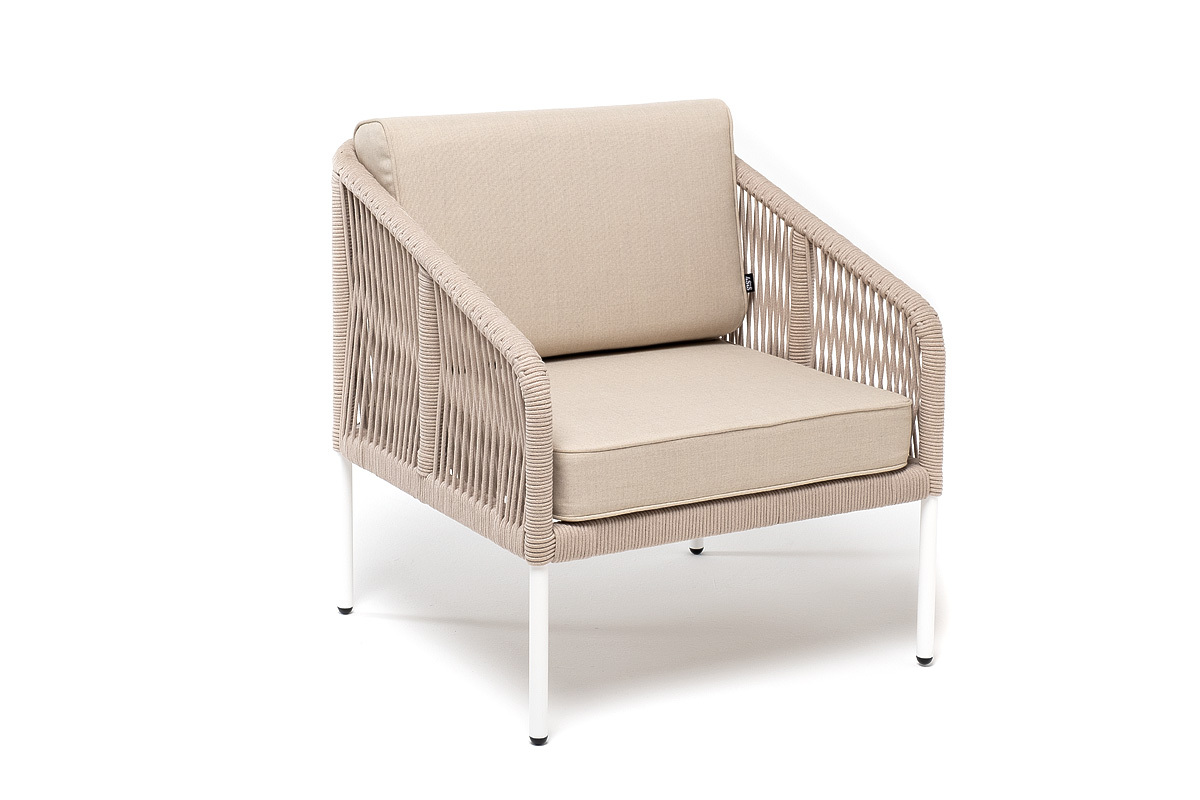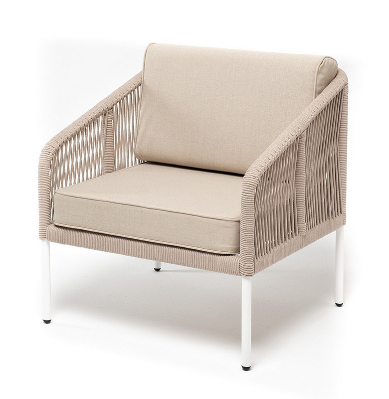 "Канны" кресло плетеное из роупа, каркас алюминий белый муар, роуп бежевый круглый, ткань бежевая 052