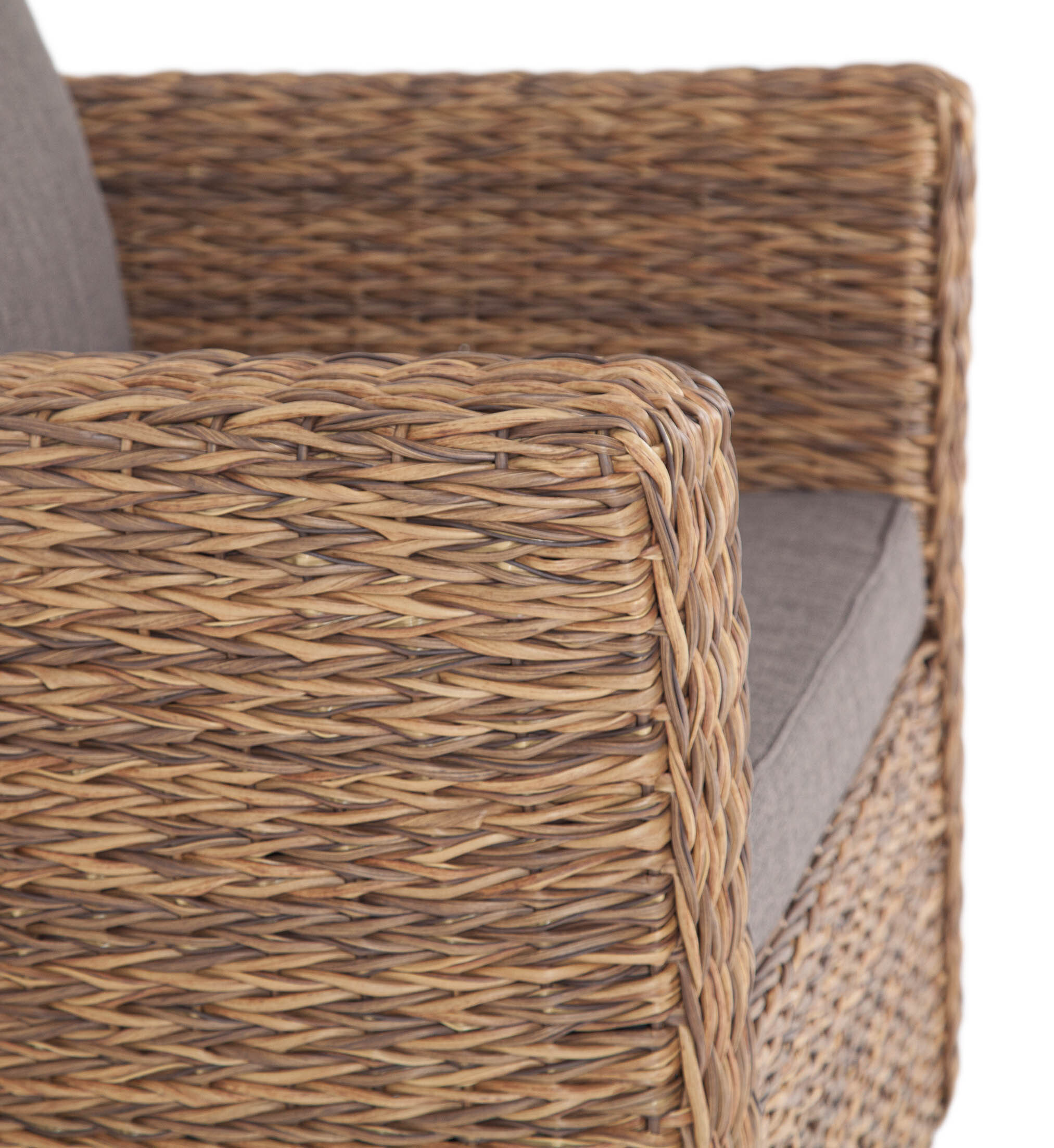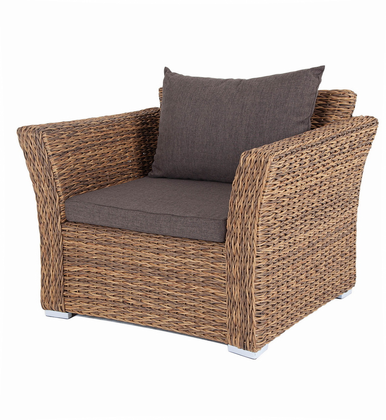 Кресло «Капучино» является практичным дополнением зоны отдыха, обустроенной мебелью из этой же серии. Размер модели – 1040×865×815 мм. Каркас изготовлен из прочного алюминия, оплетенного вручную искусственным ротангом вида «гиацинт» соломенного оттенка. Две подушки серого цвета представлены в комплекте с садовым креслом. Изделия пошиты из полиэстера плотностью 300гр/м2. В обязательном порядке материал обрабатывается влагоотталкивающей пропиткой для усиления своих защитных свойств.Бренд | 4SIS |