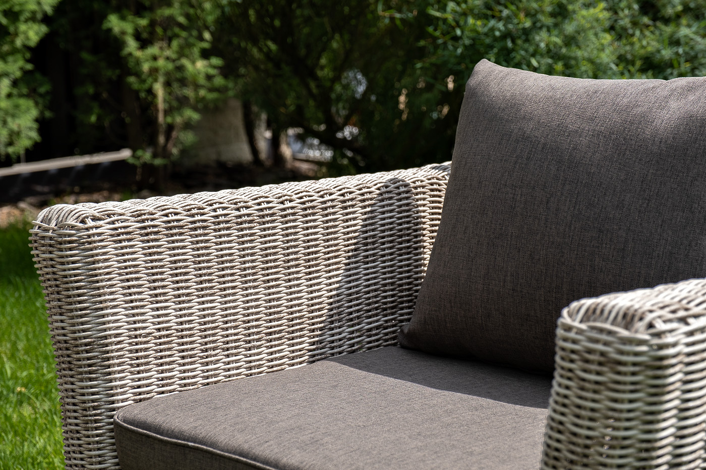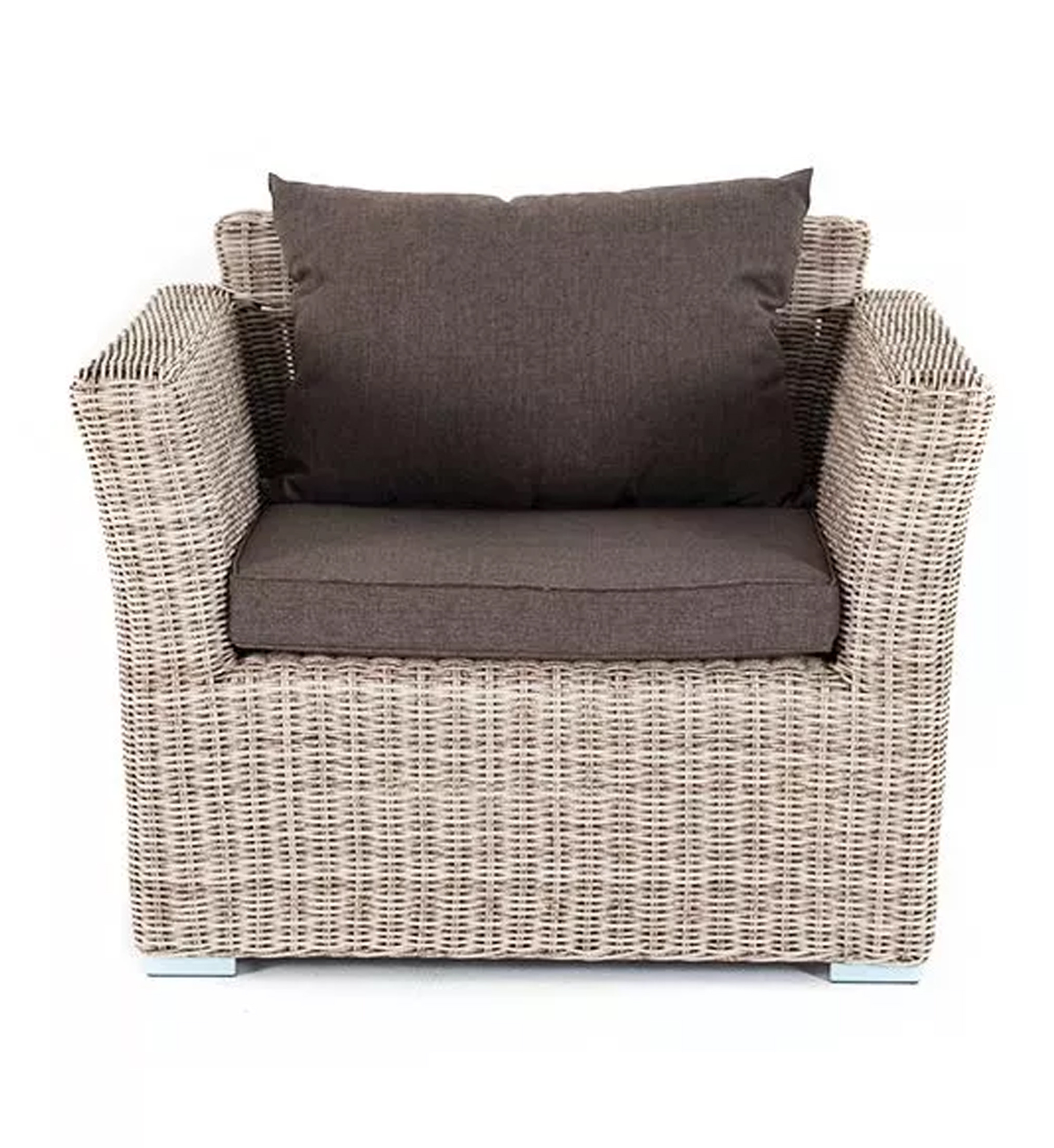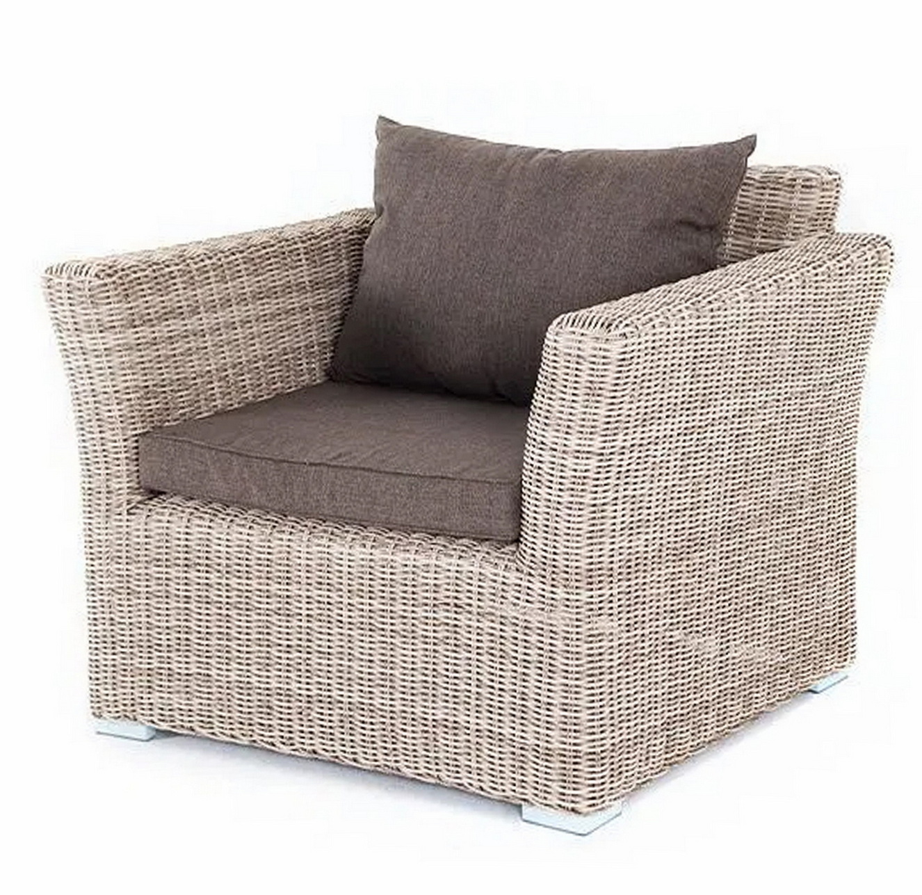 Кресло из круглого искусственного ротанга «Капучино» бежевого цвета, отлично вписывается в садовый антураж. В основе - прочный алюминиевый каркас, который отвечает за надежность конструкции. Размеры кресла - 1040×865×815 мм, в комплектацию входят две подушки, произведенные из полиэстера с влагоотталкивающей пропиткой.Бренд | 4SIS |