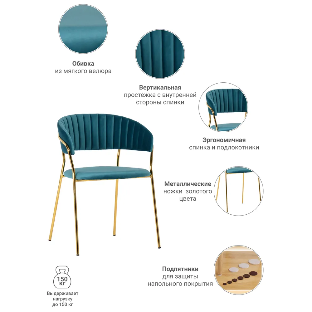 Материал: фанера, пенополиуретан, велюр Материал ножек: сталь Цвет ножек: золотой Размер стула: 56х50х78х48 см Вес стула: 5,5кг Вес комплекта: 22кг Максимальная нагрузка 150кг Поставляется в разобранном виде. В комплекте идёт инструкция и комплект аксессуаров для сборки.Характеристики