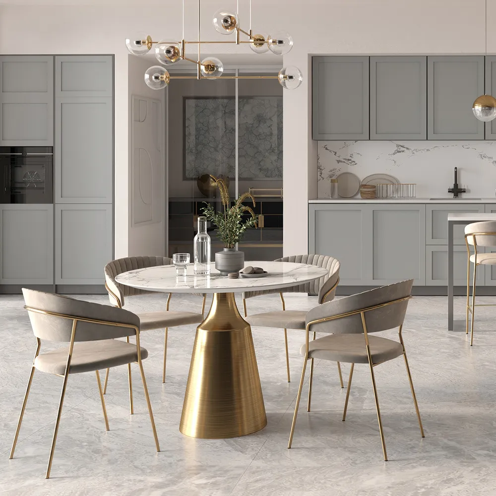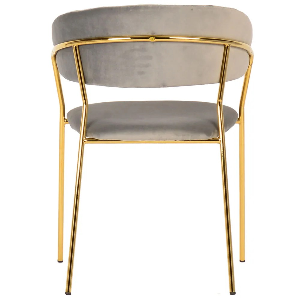 Мягкое велюровое сиденье дарит приятные тактильные ощущения и обеспечивает удобство во время длительных посиделок. Золотые металлические ножки добавляют мебели визуальной легкости и шика, подчеркивая безупречный вкус владельцев.