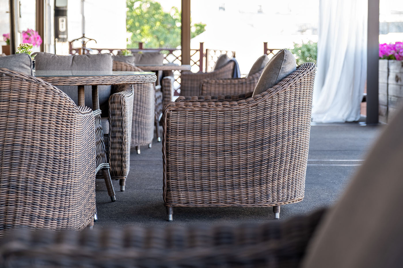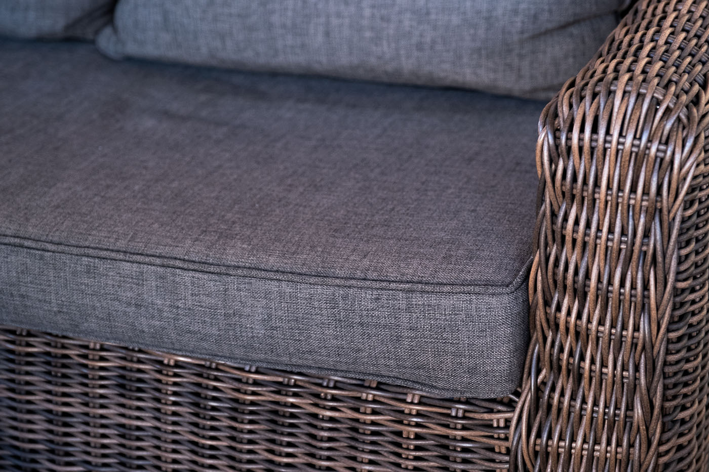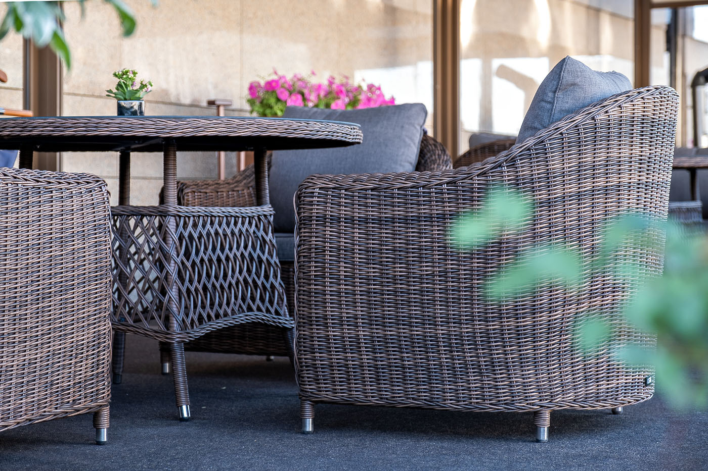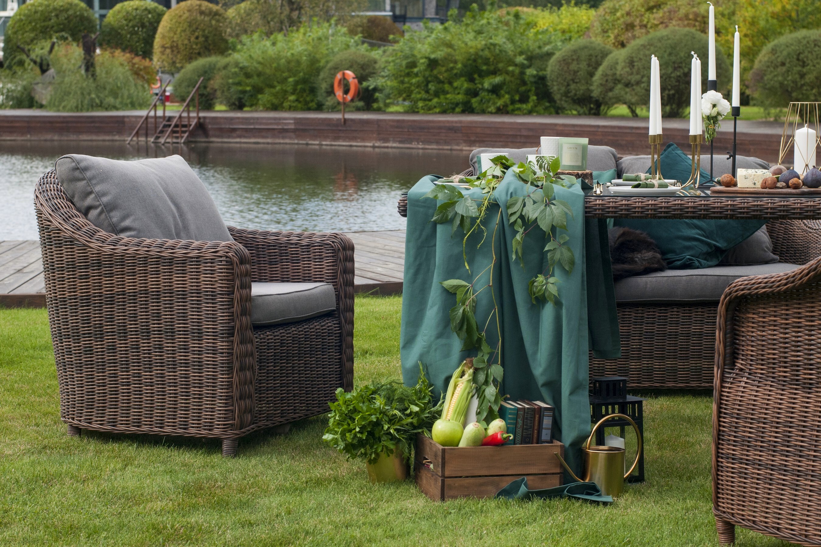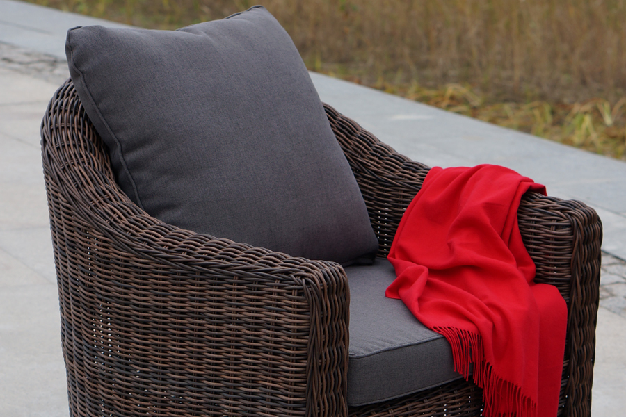 Кресло «Кон Панна» входит в лаунж-зону, состоящую из двухместного дивана, двух кресел и журнального столика. Но также может использоваться в качестве отдельного предмета. Размер модели – 800×800×800 мм. В качестве основы служит алюминиевый каркас, который оплетен круглым искусственным ротангом коричневого оттенка. У кресла есть мягкие подушки, выполненые в сером цвете. Они сделаны из прочного полиэстера с плотностью 300гр/м2. Ткань имеет влагоотталкивающую пропитку, которая защищает ее от сильного намокания.Бренд | 4SIS |