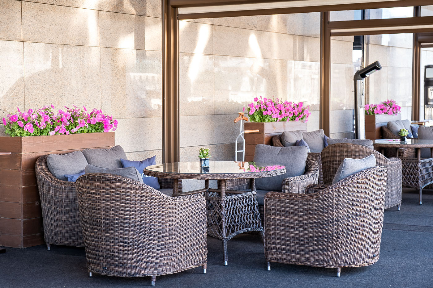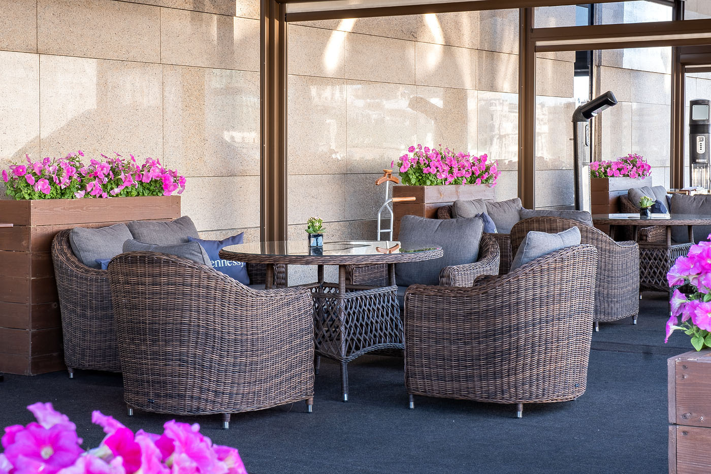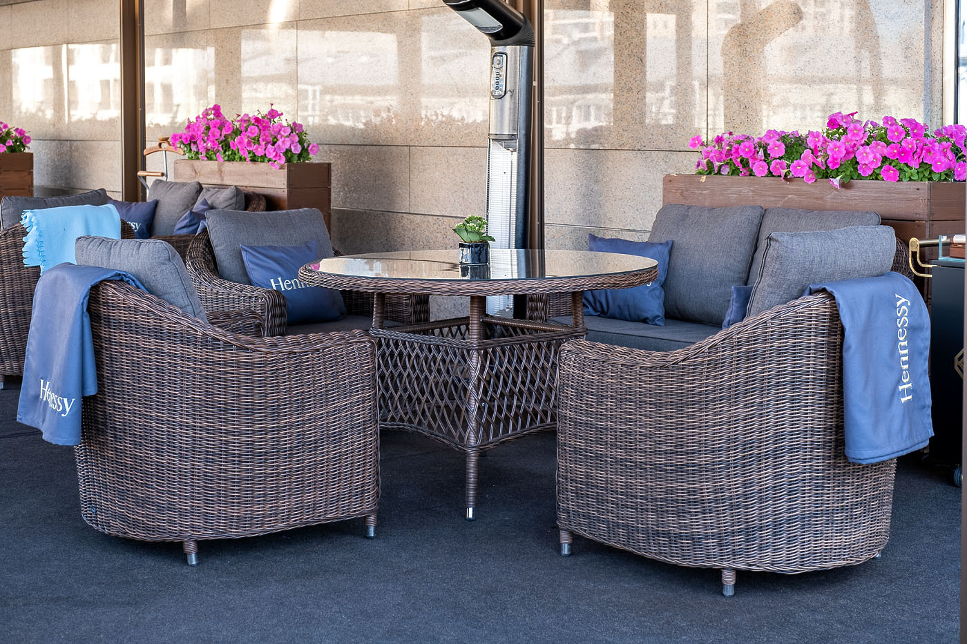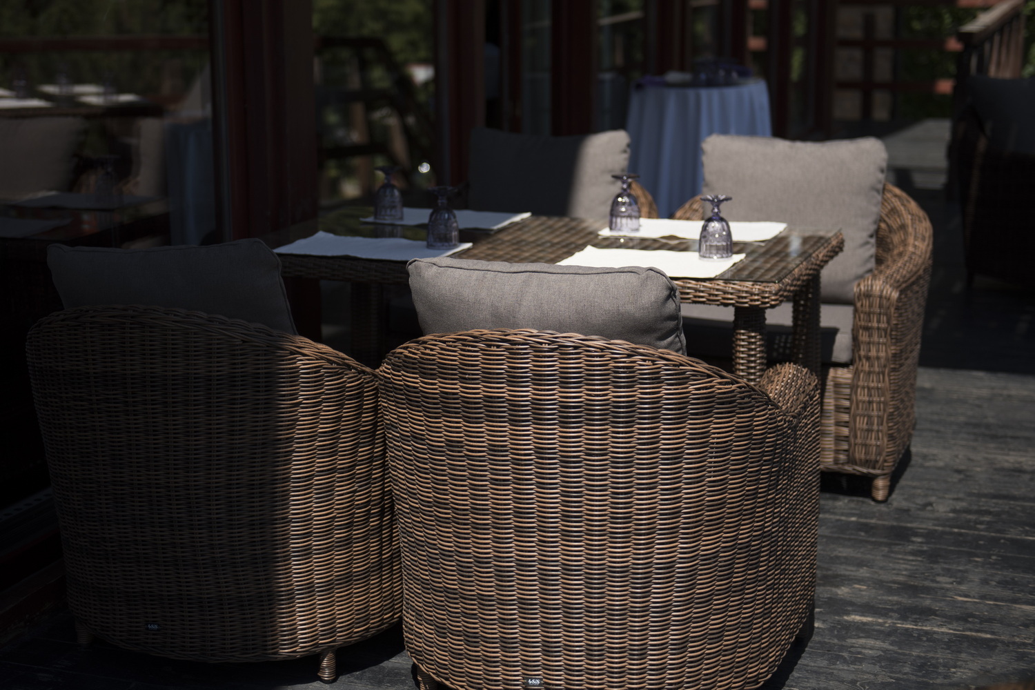 Кресло «Кон Панна» входит в лаунж-зону, состоящую из двухместного дивана, двух кресел и журнального столика. Но также может использоваться в качестве отдельного предмета. Размер модели – 800×800×800 мм. В качестве основы служит алюминиевый каркас, который оплетен круглым искусственным ротангом коричневого оттенка. У кресла есть мягкие подушки, выполненые в сером цвете. Они сделаны из прочного полиэстера с плотностью 300гр/м2. Ткань имеет влагоотталкивающую пропитку, которая защищает ее от сильного намокания.Бренд | 4SIS |